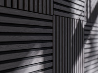 Akustikpaneele dienen der Gestaltung von Wänden und Decken. Zusätzlich stehen die akustischen Eigenschaften der Produkte im Vordergrund. Die Paneele haben eine schwarze Trägerplatte aus recyceltem, schallabsorbierenden Polyester, auf denen Lamellen (MDF) angebracht sind, die mit astfreier Eiche furniert sind.