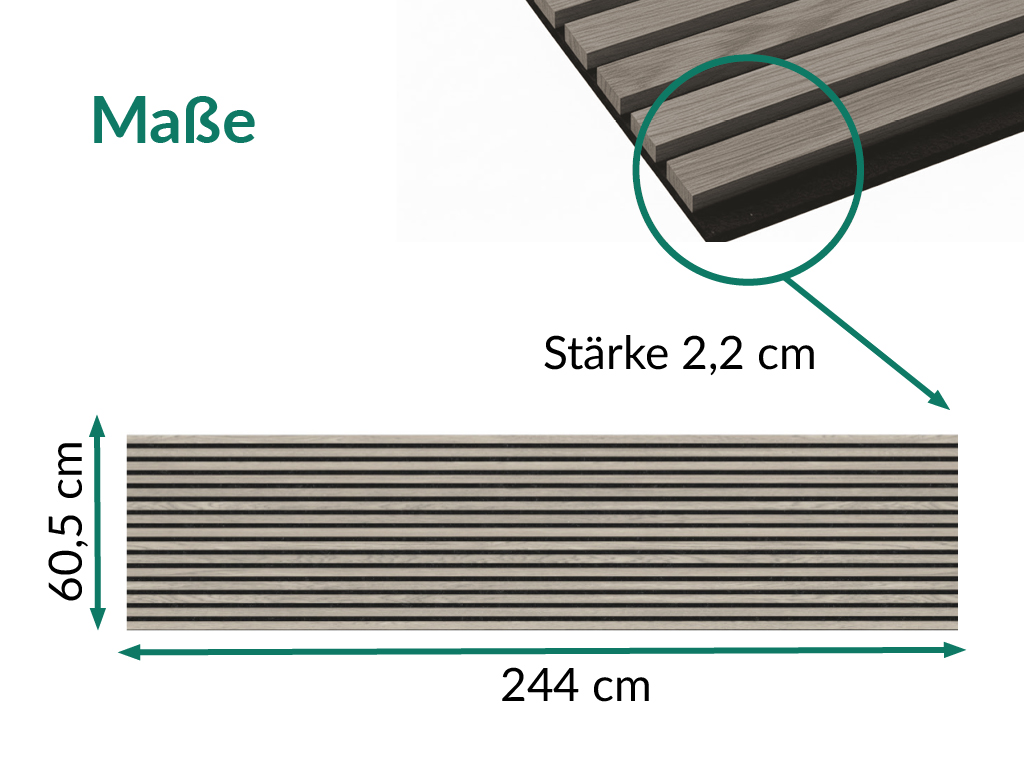 | Lieferumfang: | 1 x Akustik-Wandpaneele 244 x 60,5 cm |