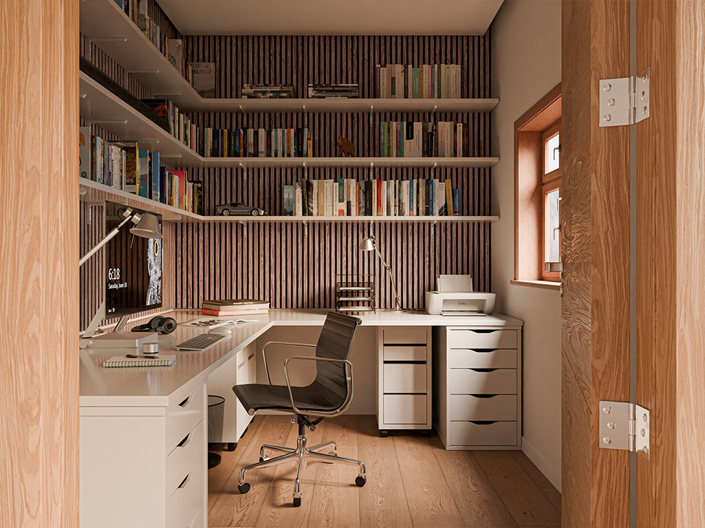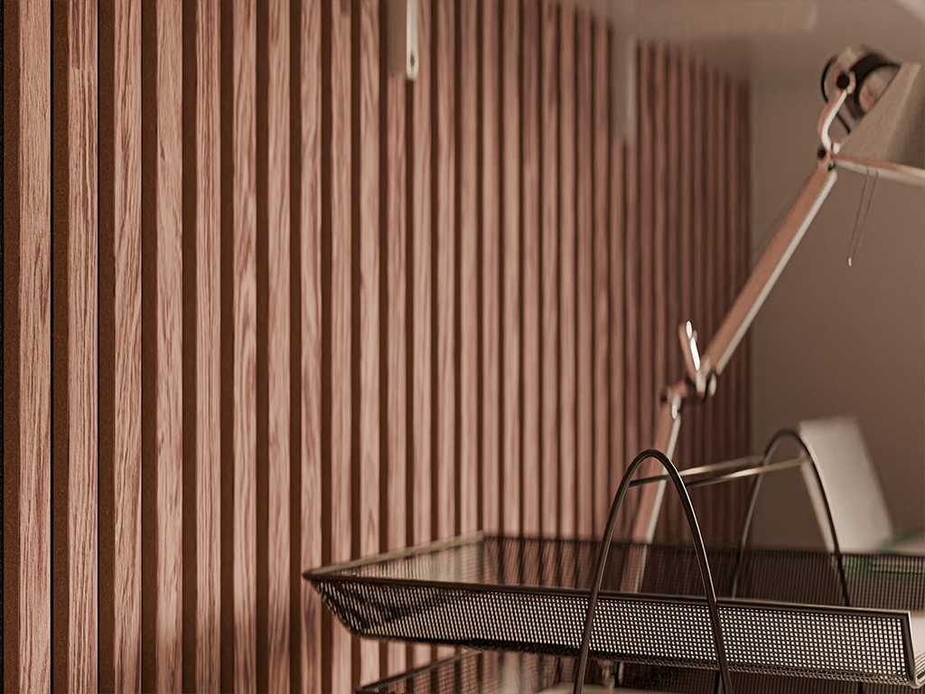Akustikpaneele dienen der Gestaltung von Wänden und Decken. Zusätzlich stehen die akustischen Eigenschaften der Produkte im Vordergrund. Die Paneele haben eine schwarze Trägerplatte aus recyceltem, schallabsorbierenden Polyester, auf denen Lamellen (MDF) angebracht sind, die mit astfreier Eiche furniert sind.