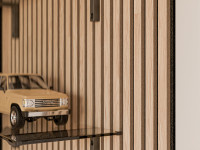 Die Akustikpaneele dienen der Gestaltung von Wänden und Decken. Zusätzlich stehen die akustischen Eigenschaften der Produkte im Vordergrund. Die Paneele haben eine Trägerplatte aus schallabsorbierendem, schwarzem Filz (vegan) mit einem hohen Recyclinganteil von 70%, auf denen Lamellen (MDF) angebracht sind.