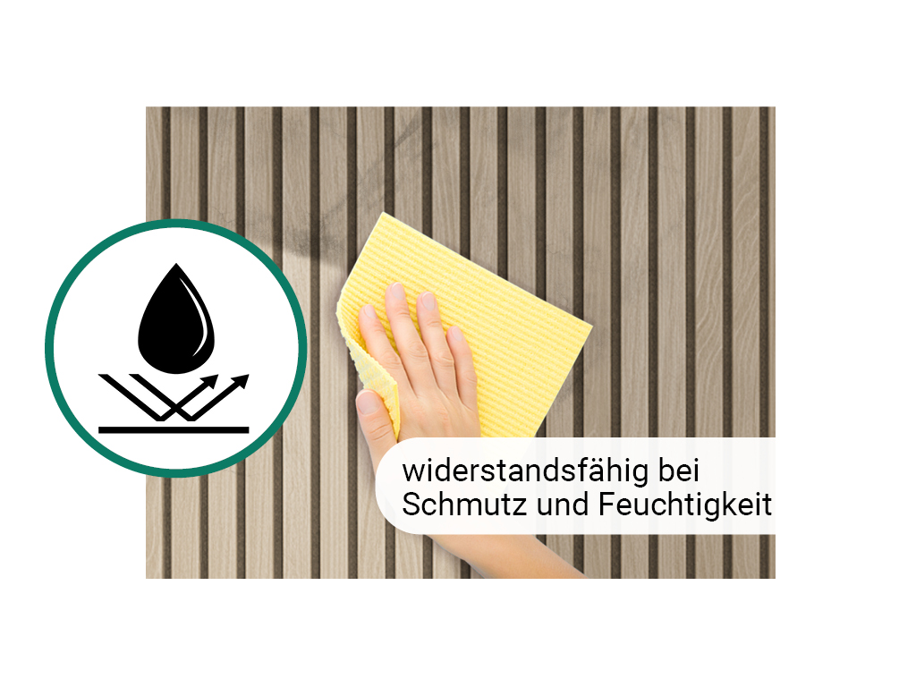 - Einfache Reinigung und Pflege (glatte Oberfläche, kein rohes/splitterndes/ feuchtigkeitsempfindliches Furnier)