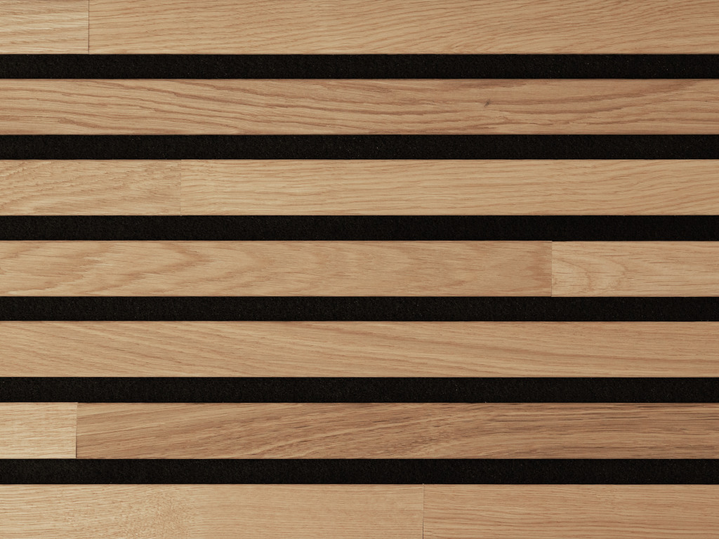 Die Akustikpaneele haben eine Gesamtlänge von 2.600 mm und eine handliche Breite von 330 mm. Dadurch, dass die Lamellen durchgängig geklebt und nicht partiell getackert sind, können sie überall abgeschnitten bzw. gekürzt werden. Die Filzschicht ist 8 mm dick und die Massivholzstreifen mit seitlicher Microfaser darüber nehmen 5 mm in Anspruch.