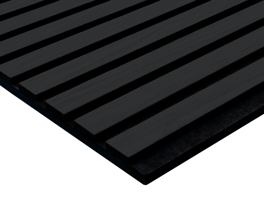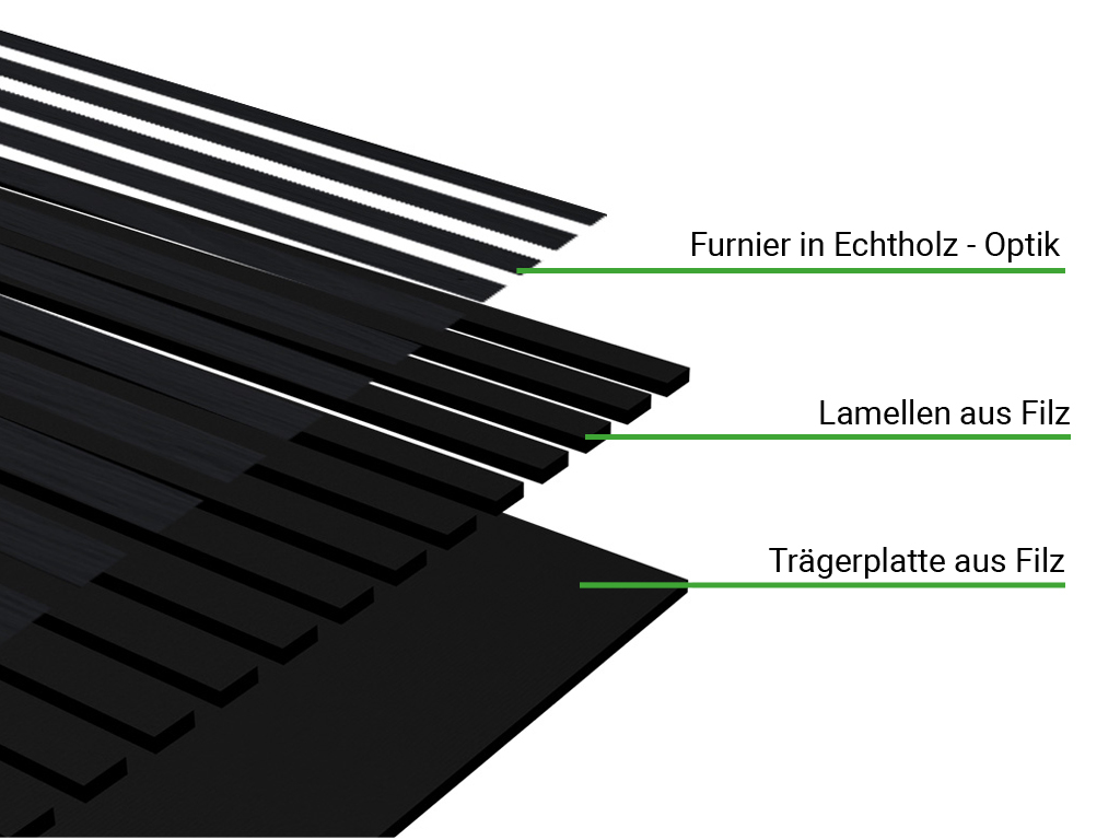 Die Paneele bestehen aus einer einseitig furnierten Trägerplatte aus schwarzem Filz, auf der 6 mm starke Filz-Lamellen angebracht sind. Diese besondere Struktur ermöglicht eine optimale akustische Regulierung und Nachhalldämpfung.