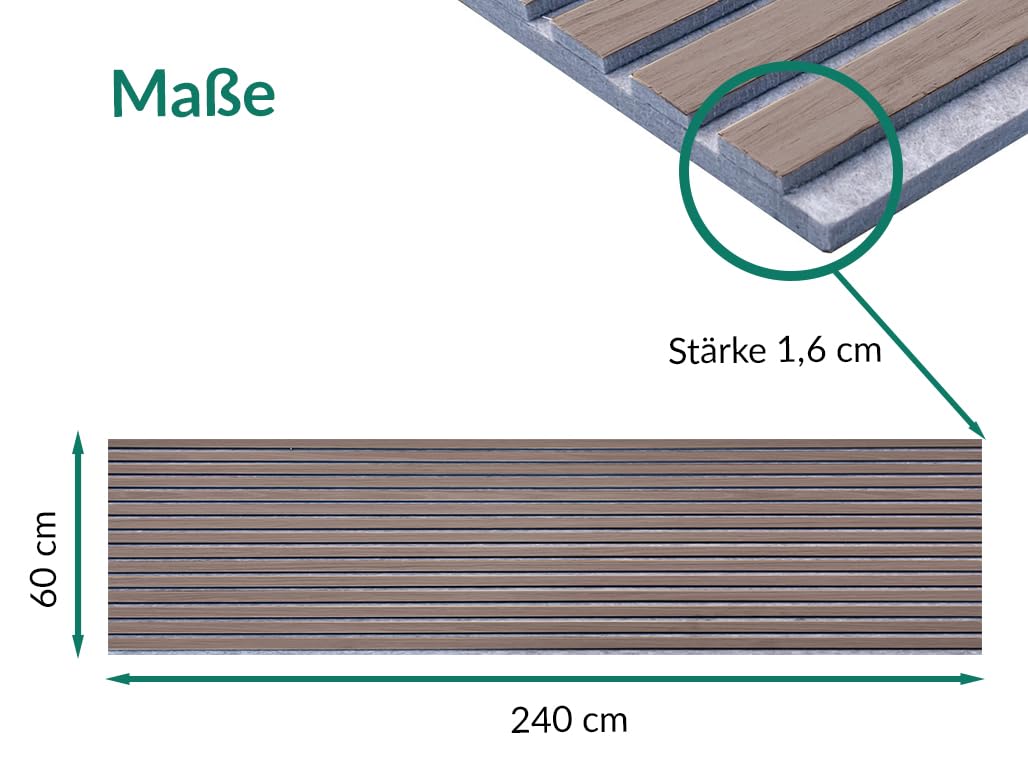 | Lieferumfang: | 1 x Akustikpaneele 240 x 60 cm (entspricht 1,44 qm) |