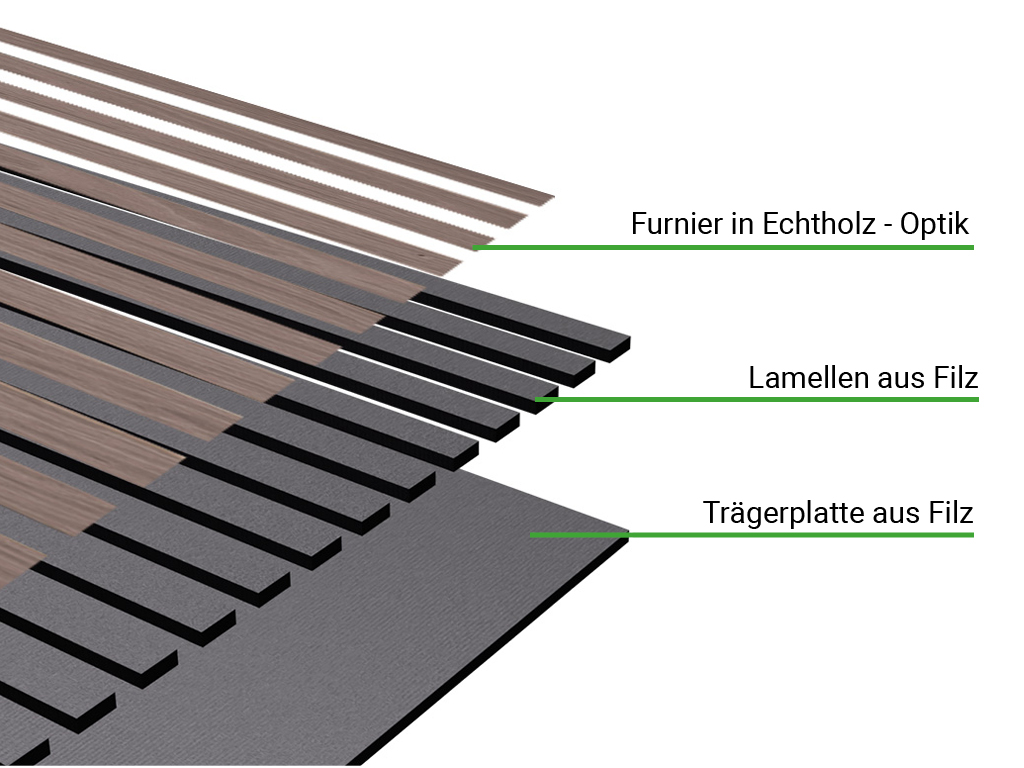 Die Paneele bestehen aus einer einseitig furnierten Trägerplatte aus schwarzem Filz, auf der 6 mm starke Filz-Lamellen angebracht sind. Diese besondere Struktur ermöglicht eine optimale akustische Regulierung und Nachhalldämpfung.
