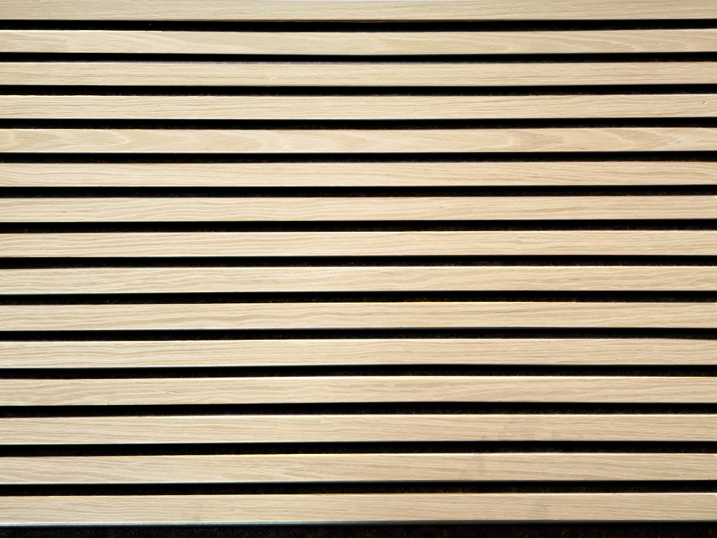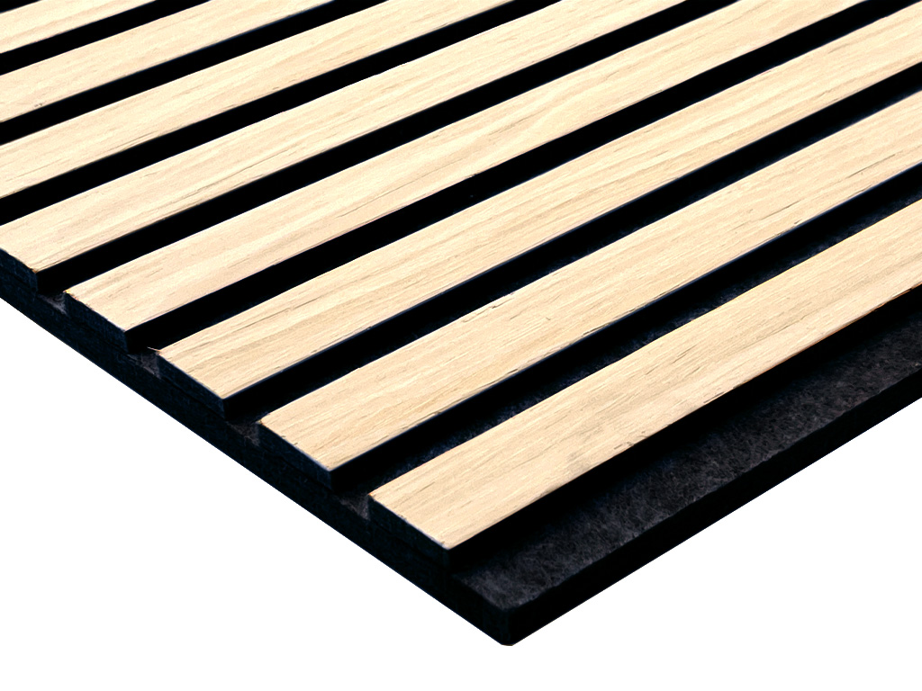 Die Paneele bestehen aus einer einseitig furnierten Trägerplatte aus schwarzem Filz, auf der 6 mm starke Filz-Lamellen angebracht sind. Diese besondere Struktur ermöglicht eine optimale akustische Regulierung und Nachhalldämpfung.