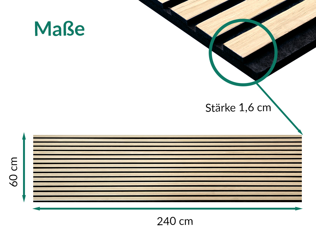 | Lieferumfang: | 1 x Akustikpaneele 240 x 60 cm (entspricht 1,44 qm) |