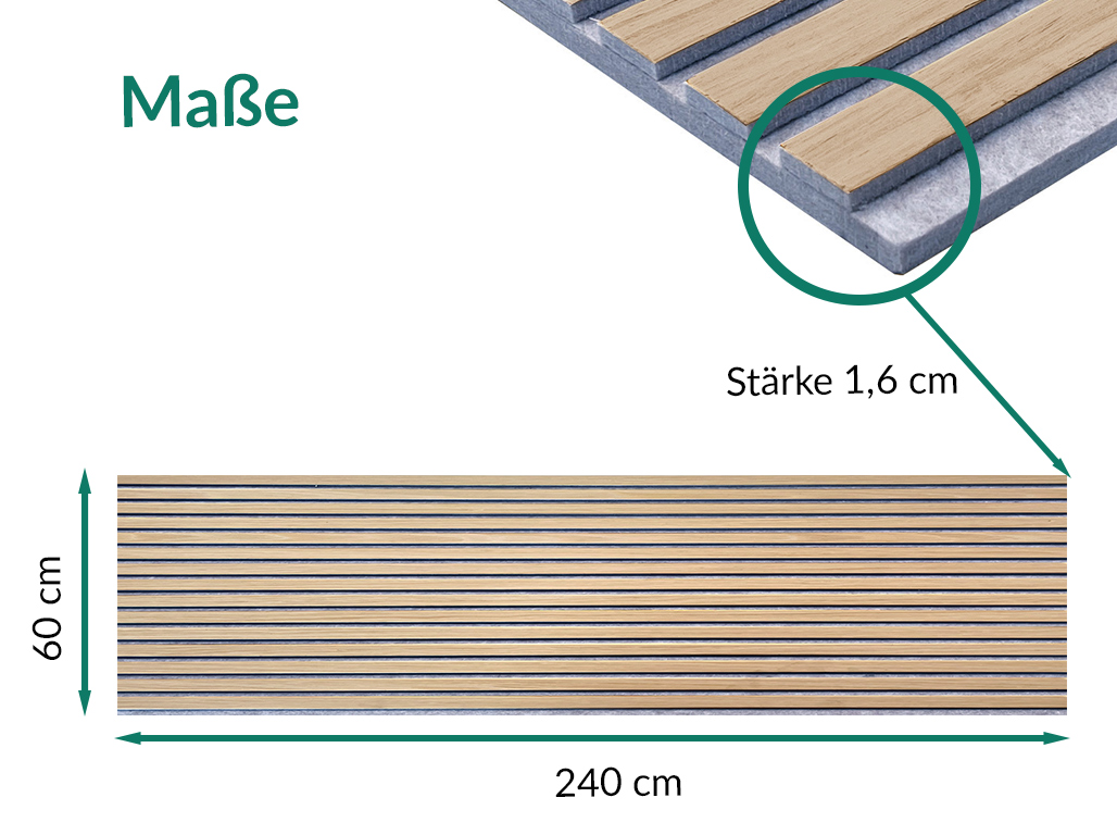 | Lieferumfang: | 1 x Akustikpaneele 240 x 60 cm (entspricht 1,44 qm) |