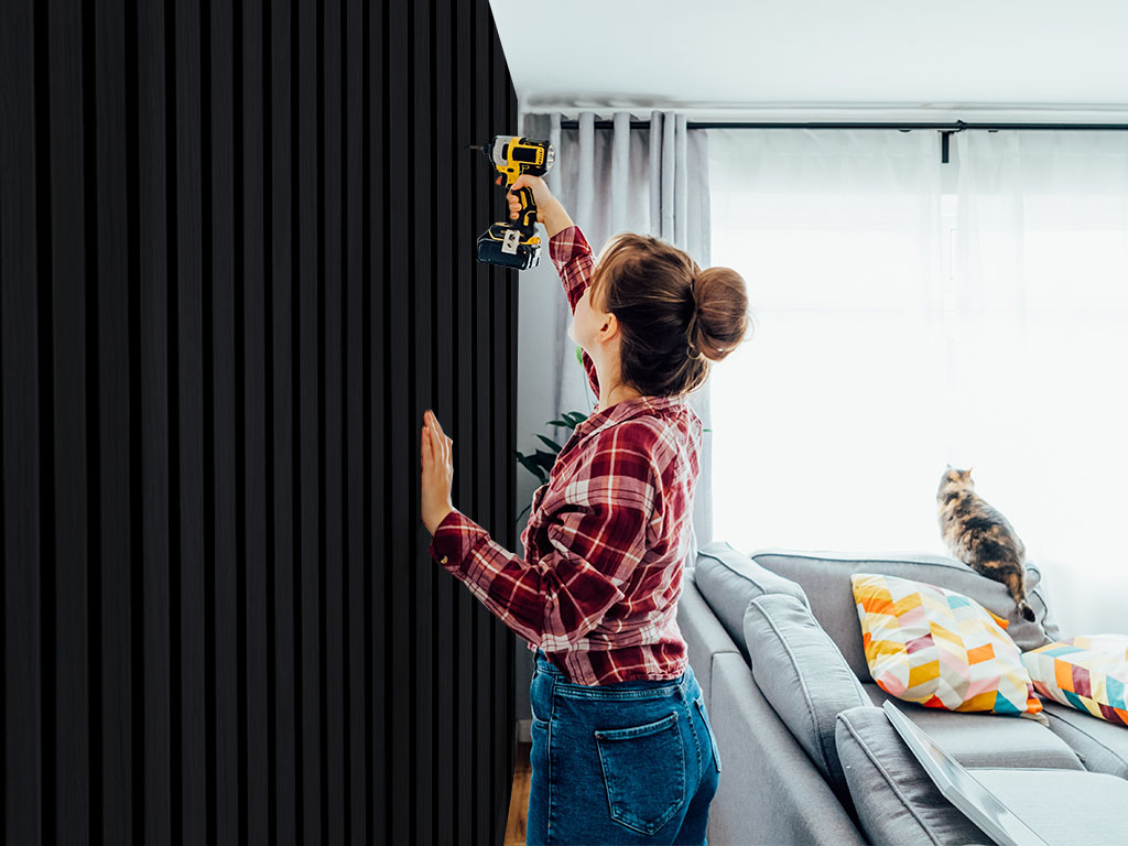 Die Akustikpaneele werden als ganze Platten geliefert, was die Installation denkbar einfach macht – sie können im Handumdrehen an Wänden oder Zimmerdecken montiert werden. Lege zunächst fest, in welcher Ausrichtung du die Paneele anbringen möchtest und kürze sie bei Bedarf passend. Anschließend an die Wand schrauben oder kleben – fertig!