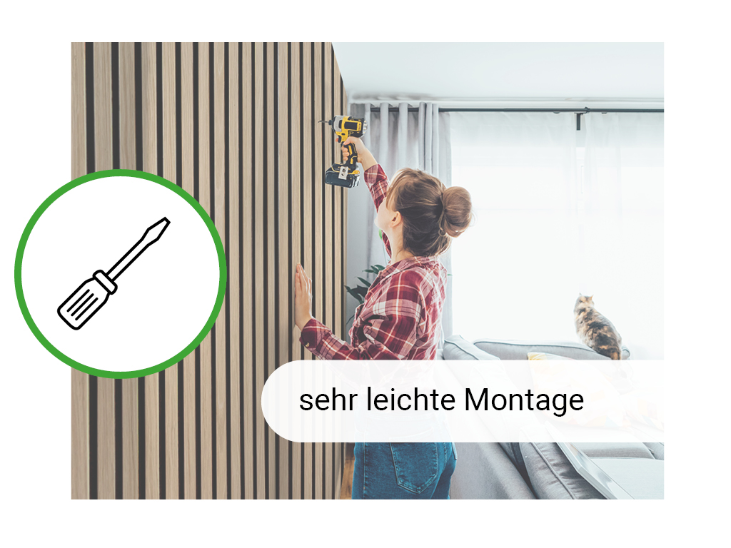 Die Akustikpaneele werden als ganze Platten geliefert, was die Installation denkbar einfach macht – sie können im Handumdrehen an Wänden oder Zimmerdecken montiert werden. Lege zunächst fest, in welcher Ausrichtung du die Paneele anbringen möchtest und kürze sie bei Bedarf passend. Anschließend an die Wand schrauben oder kleben – fertig!