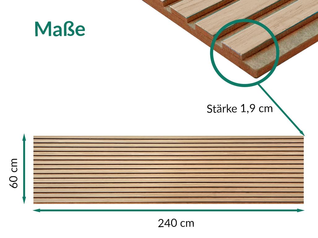 | Lieferumfang: | 1 x Akustikpaneele 240 x 60 cm (entspricht 1,44 m²) |