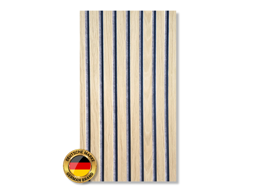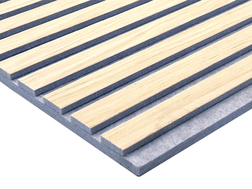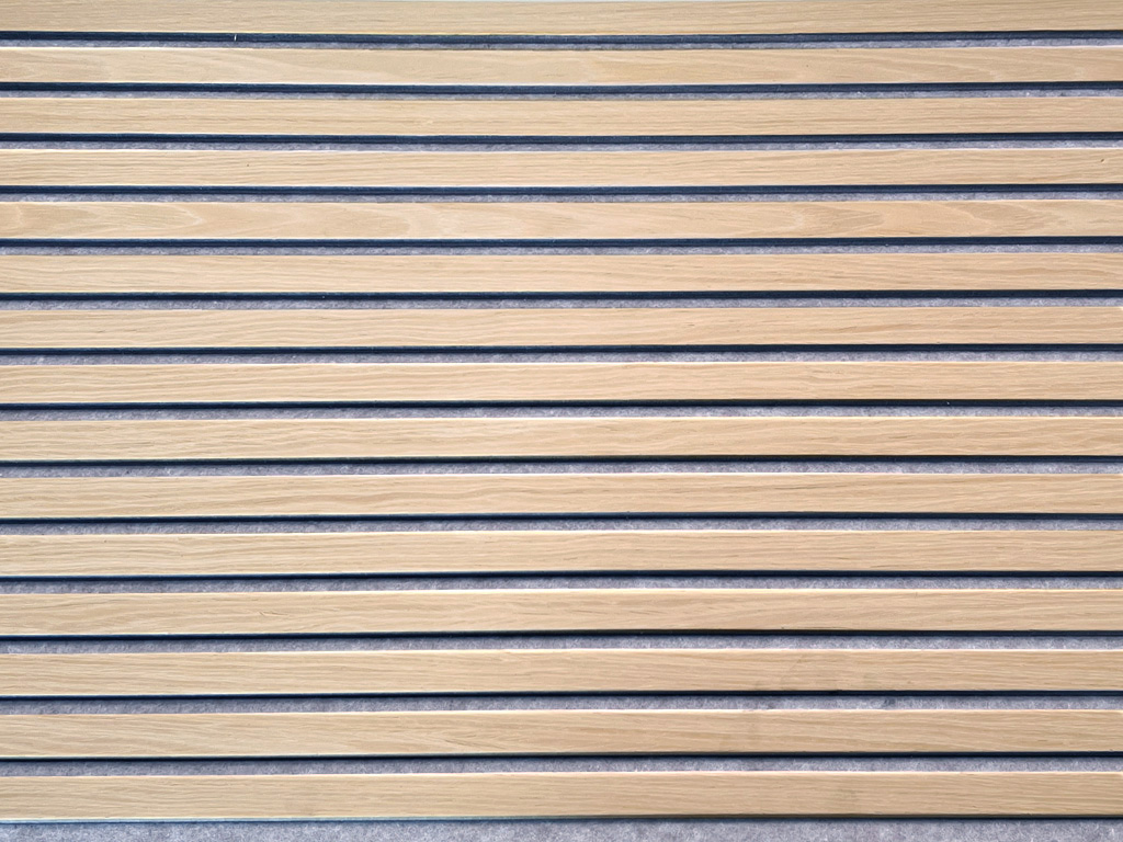 Die Paneele bestehen aus einer dreiseitig furnierten Trägerplatte aus schwarzem Filz, auf der 9 mm starke Filz-Lamellen angebracht sind. Diese besondere Struktur ermöglicht eine optimale akustische Regulierung und Nachhalldämpfung.