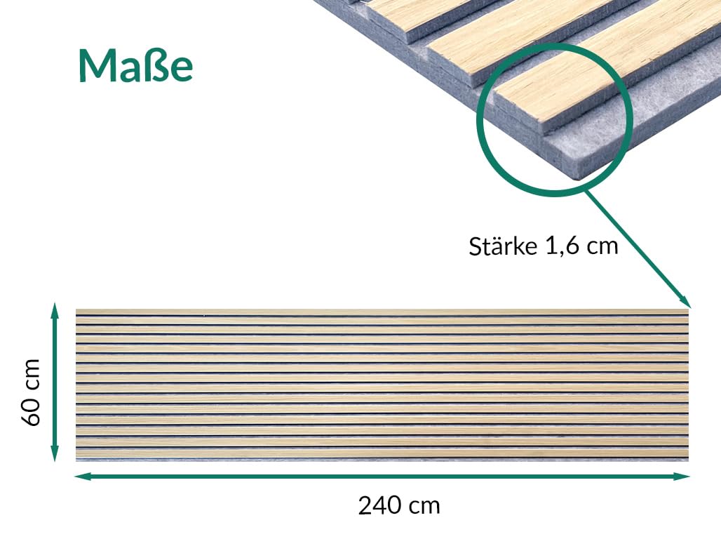 | Lieferumfang: | 1 x Akustikpaneele 240 x 60 cm (entspricht 1,44 qm) |