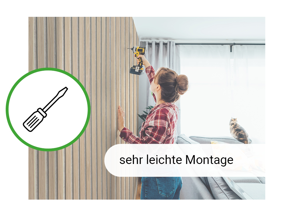 Die Akustikpaneele werden als ganze Platten geliefert, was die Installation denkbar einfach macht – sie können im Handumdrehen an Wänden oder Zimmerdecken montiert werden. Lege zunächst fest, in welcher Ausrichtung du die Paneele anbringen möchtest und kürze sie bei Bedarf passend. Anschließend an die Wand schrauben oder kleben – fertig!