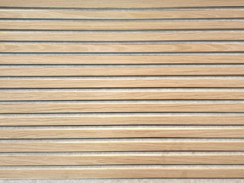 Die Paneele bestehen aus einer dreiseitig furnierten Trägerplatte aus schwarzem Filz, auf der 9 mm starke Filz-Lamellen angebracht sind. Diese besondere Struktur ermöglicht eine optimale akustische Regulierung und Nachhalldämpfung.