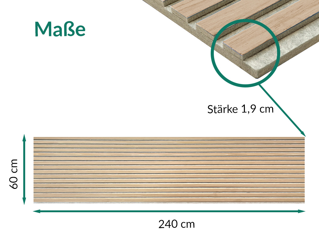 | Lieferumfang: | 1 x Akustikpaneele 240 x 60 cm (entspricht 1,44 qm) |