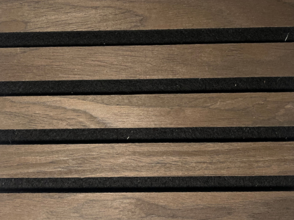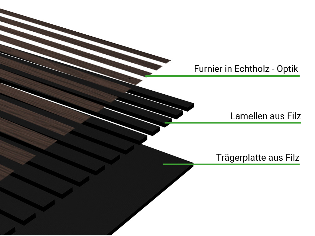 Die Paneele bestehen aus einer dreiseitig furnierten Trägerplatte aus schwarzem Filz, auf der 9 mm starke Filz-Lamellen angebracht sind. Diese besondere Struktur ermöglicht eine optimale akustische Regulierung und Nachhalldämpfung.