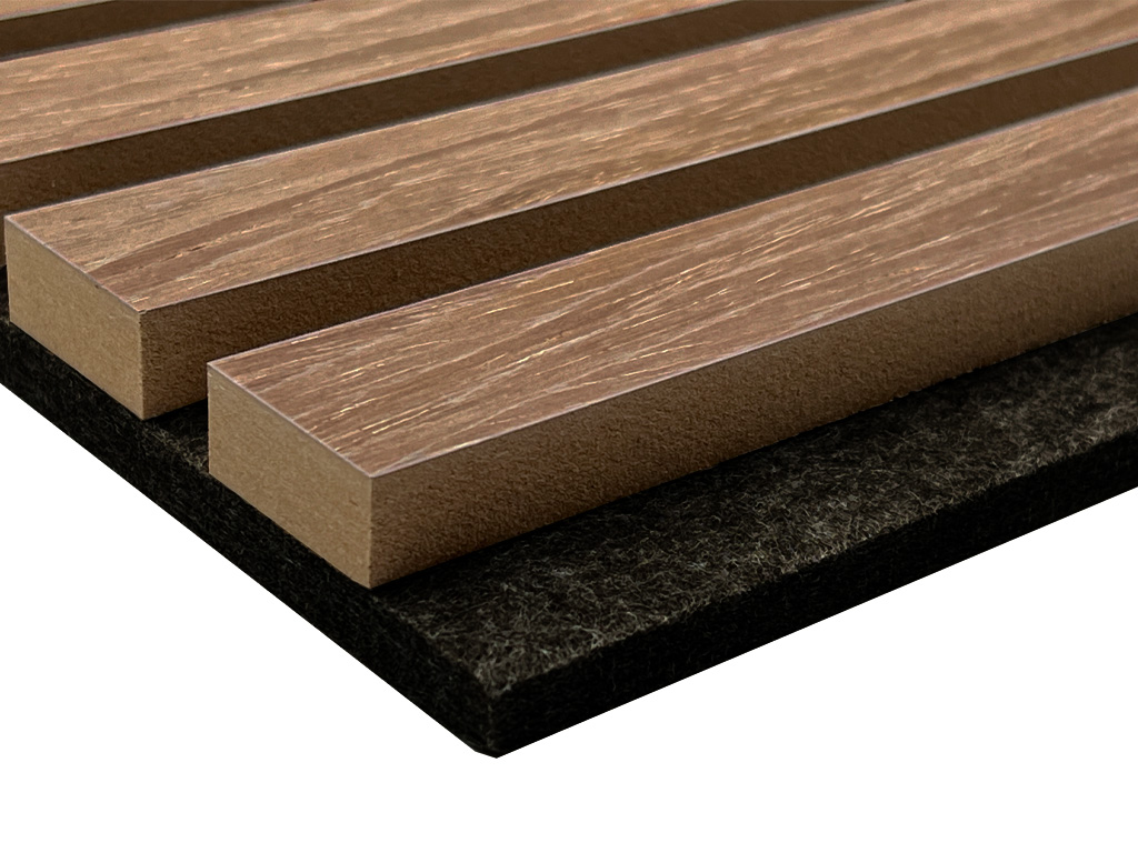 Die Paneele bestehen aus einer Trägerplatte, auf der Lamellen aus Holz angebracht sind. Diese besondere Struktur ermöglicht eine optimale akustische Regulierung und Nachhalldämpfung.