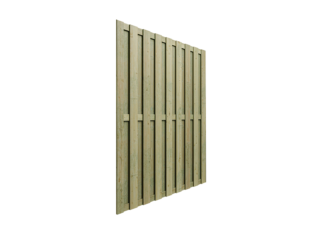Die Holzlatten haben eine Stärke von ca. 12,5-13 x 120 mm und eine Gesamtstärke von ca. 4,5 cm. Der Zaun kann in der Breite beliebig gekürzt werden. Aufgebaut hat der Zaun eine Gesamtgröße von 180 x 180 cm.