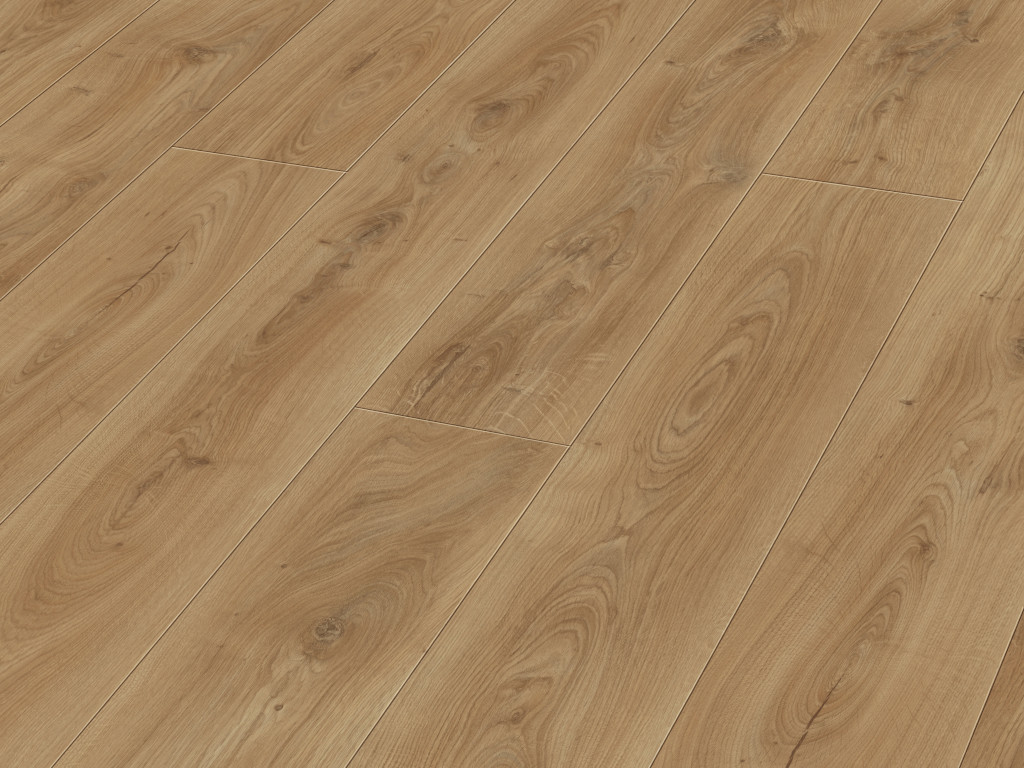 Das Dekor in edler Eichenholzoptik passt perfekt zu nahezu allen aktuellen Einrichtungsstilen. Landhausdielen besitzen mit ihrer Ein-Stab-Optik einen natürlichen und rustikalen Look, der jeden Raum gemütlich wirken lässt. Die 4-seitig umlaufende V-Fuge der Diele betont den rustikalen Charakter.