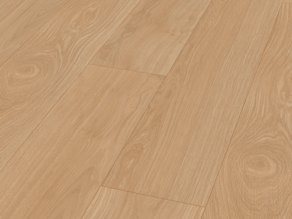 Das Dekor in authentischer Eichenholzoptik vermittelt fühlbare Wärme und Behaglichkeit. Landhausdielen wirken mit ihrer 1-Stab-Optik elegant, rustikal und voller Charakter. Die 4-seitig umlaufende V-Fuge betont den Dielencharakter. Dank modernster Herstellungsverfahren werden Musterwiederholungen in der Oberflächenstruktur weitestgehend vermieden, sodass ein natürlich authentischer Holzlook entsteht.