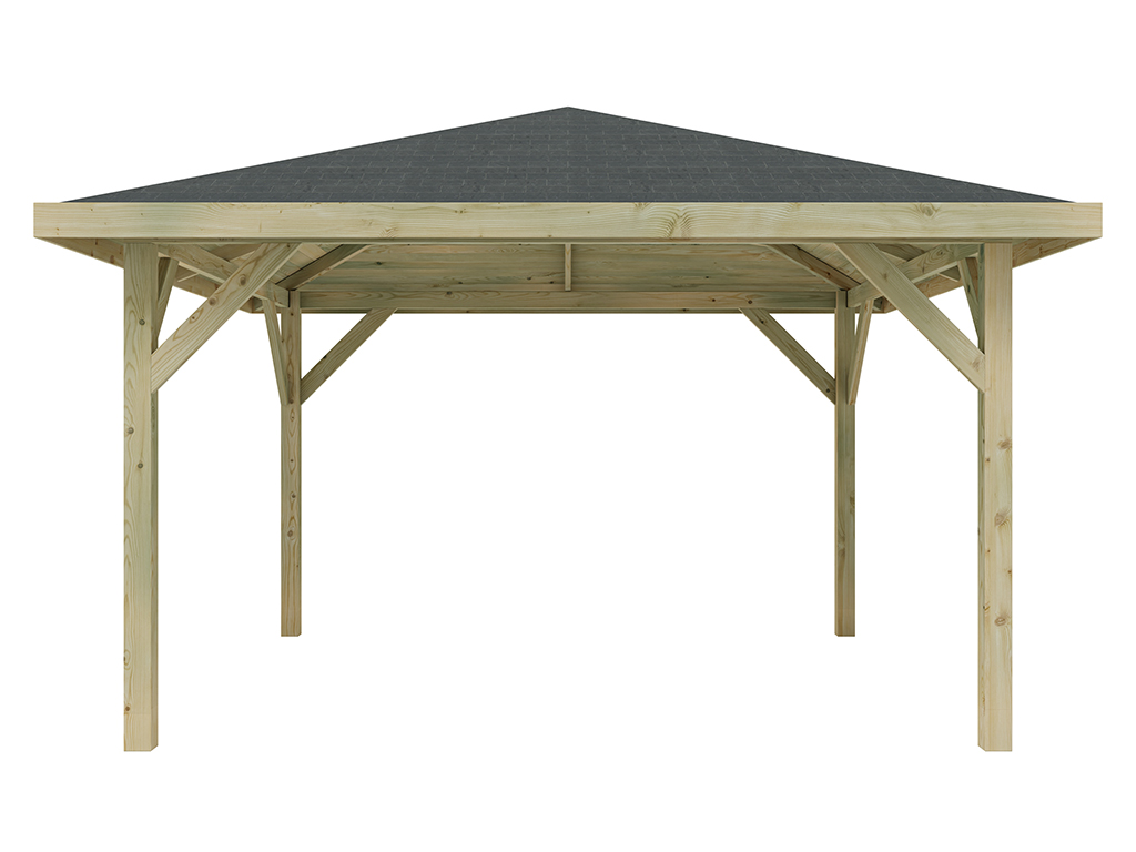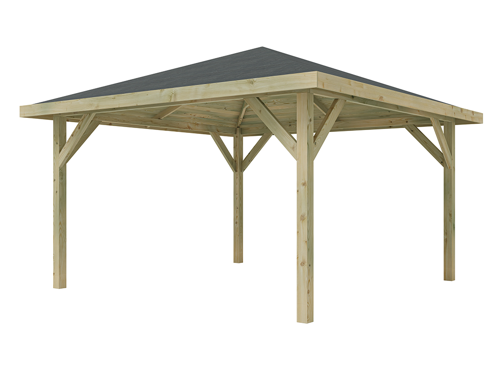 B x T x H: 430 x 430 x 330 cm, Sockelmaß B x T: 347 x 347 cm, Pfostenstärke 11,5 x 11,5 cm