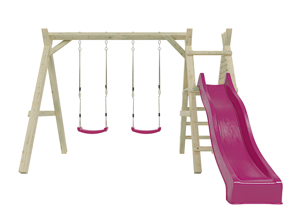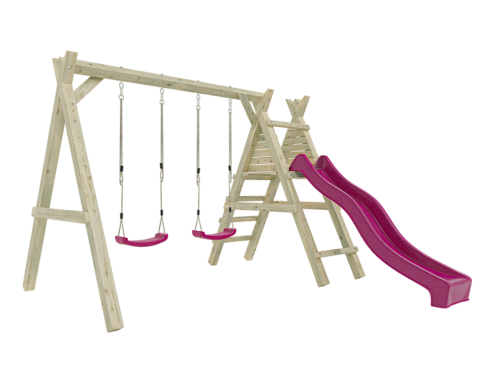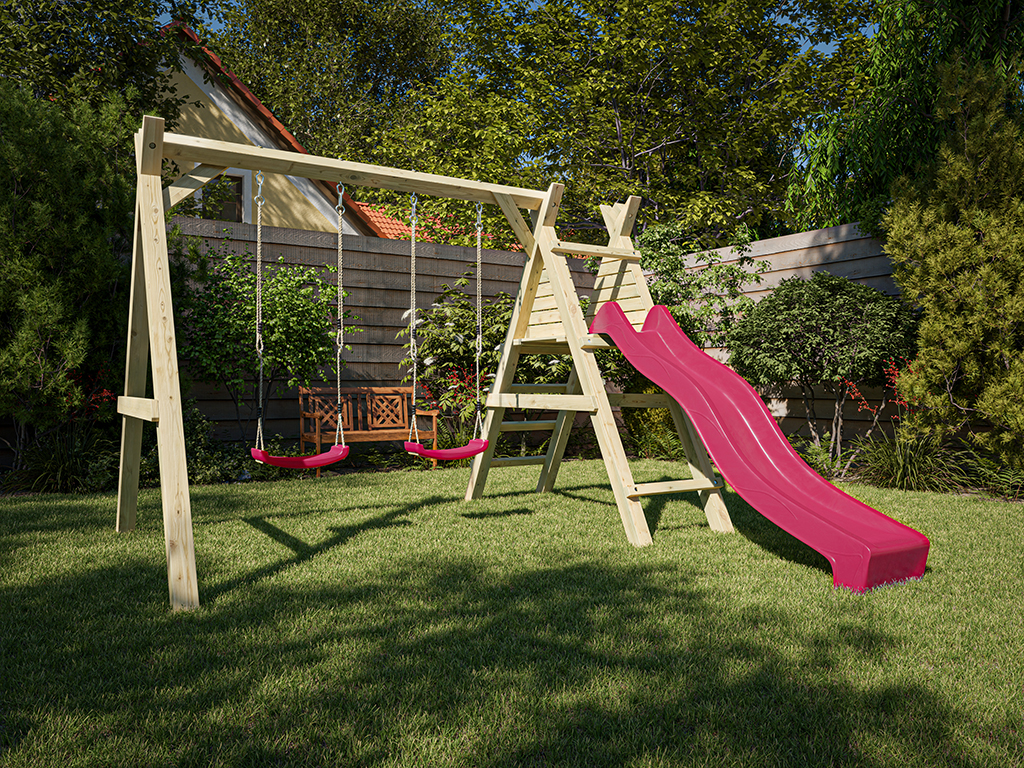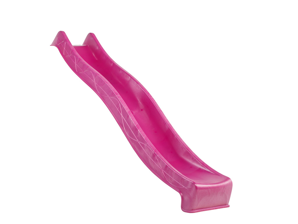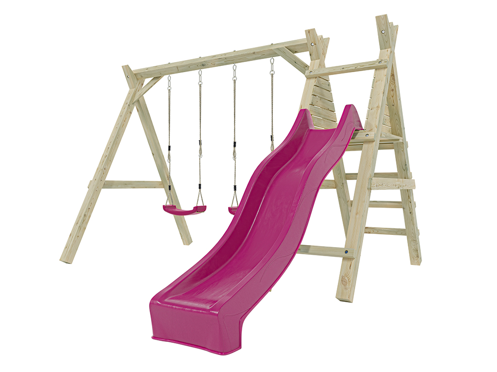 Eine 2,28 Meter lange, pinke Wellenrutsche für die Montage am Podest ist im Sparset bereits enthalten. Die Rutsche lässt sich mit wenigen Handgriffen in eine Wasserrutsche verwandeln. Hierfür befindet sich an der Unterseite der Rutsche ein Anschluss für den Gartenschlauch, der einmalig mit einem Bohrloch hergestellt werden kann. - Inkl. Schaukelsitze