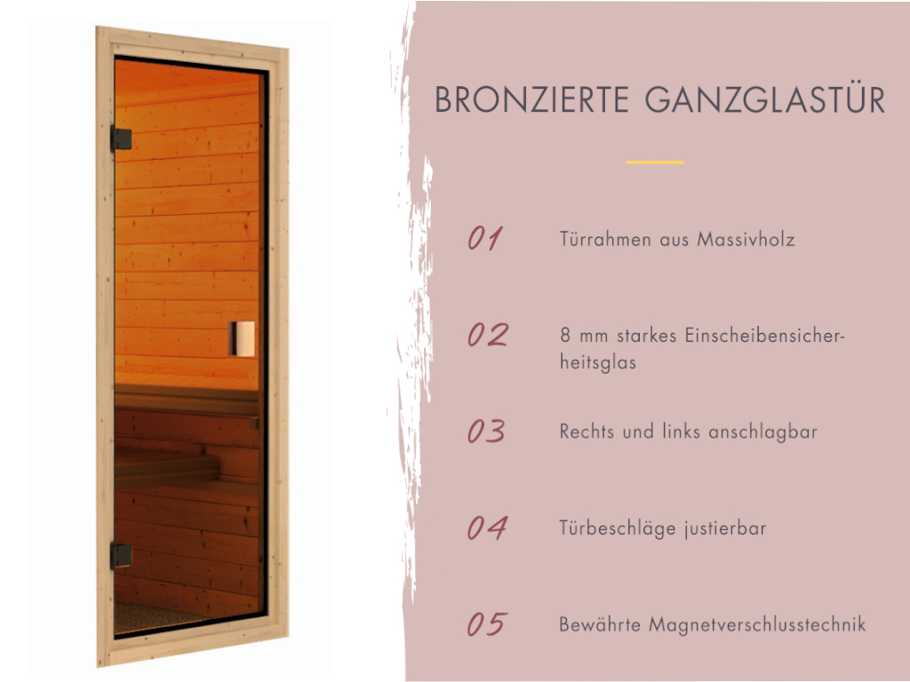 - Bodenrost aus fußwarmem Fichtenholz: für angenehmes Auftreten innerhalb und außerhalb der Sauna.