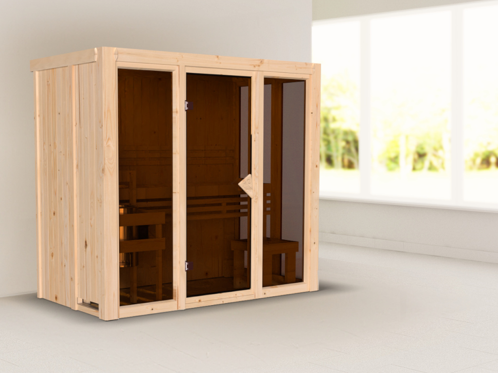 Dieses Saunamodell – eine System- bzw. Elementsauna – zeichnet sich durch seine besondere Sandwich-Bauweise aus, d. h., die Wandelemente bestehen aus einzelnen Schichten. Die bereits vorgefertigten Wandelemente aus Fichte ermöglichen einen schnellen Aufbau innerhalb weniger Stunden. Mit einer Wandstärke von 68 mm sind Systemsaunen optimal isoliert und somit besonders energiesparend. Wegen der sehr gut gedämmten Elemente heizt sich die Systemsauna extra schnell auf.