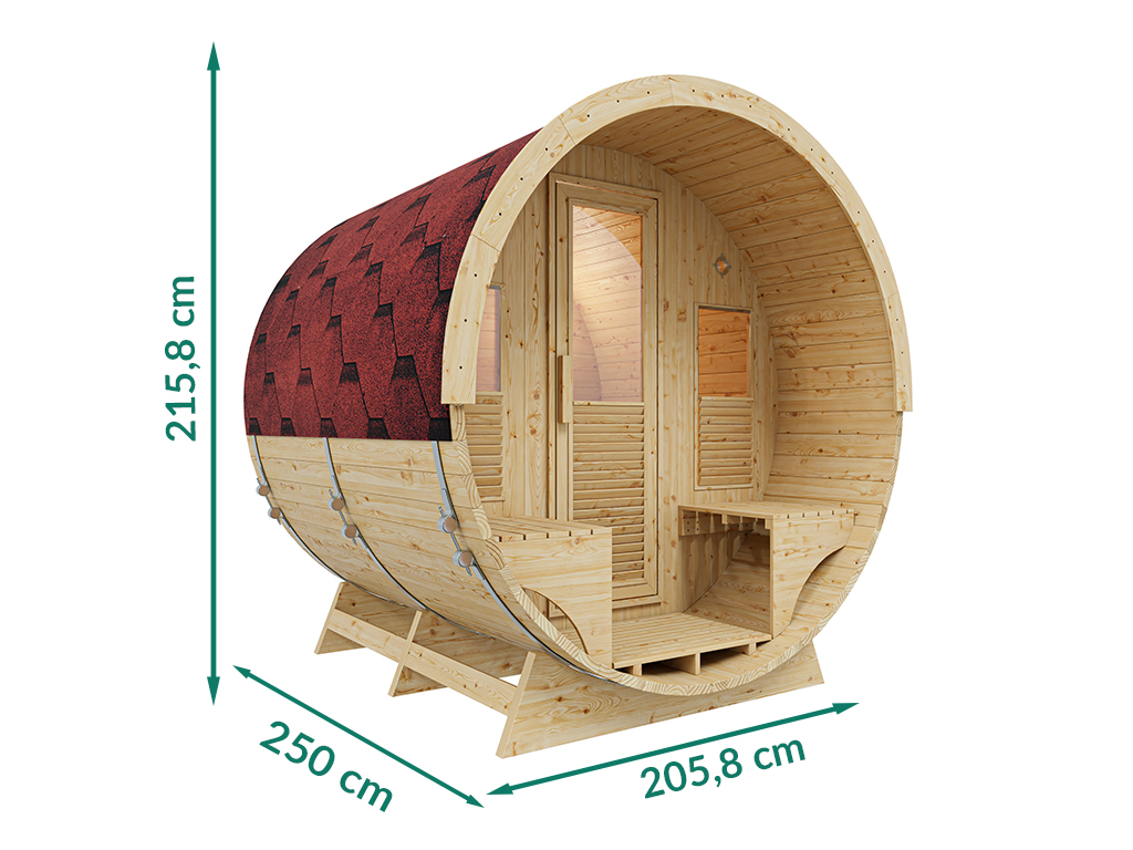 B x T x H: 205,8 x 250 x 215,8 cm, inkl. 8 kW Harvia Ofen + integ. Steuerung
