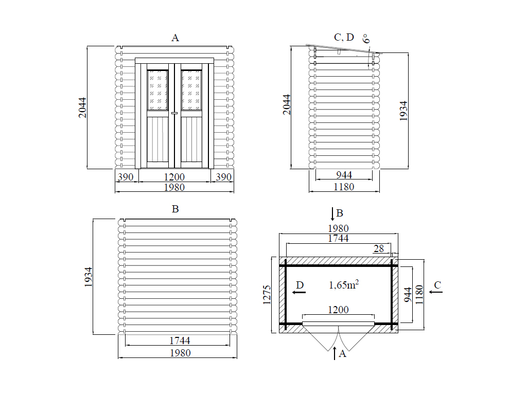 Die Grundfläche des Gartenhauses beträgt 1,65 m² mit einem Sockelmaß von 174,4 x 94,4 cm (B x T). Eine optimale Raumnutzung wird dank einer Firsthöhe von 204,4 cm gewährt.