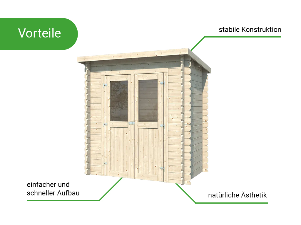 Als der Klassiker unter den Gartenhäusern verfügt ein Blockbohlenhaus über eine sehr robuste Bauweise, gepaart mit einer besonderen, natürlichen Ästhetik. Dabei orientiert sich die Bohlenbauweise an der traditionellen Blockhütte. Die Wände setzen sich aus vorgefertigten Holzbohlen zusammen, die dank einer Nut- und Feder-Verbindung ohne größere Anstrengungen aufeinander gesteckt werden können. Damit ist ein einfacher und schneller Auf- und Abbau garantiert. An der Kopfseite des Gartenhauses sorgt die charakteristische Verkämmung (spezielle Einkerbungen im Holz) nicht nur für eine schöne Optik, sondern hält das ganze Konstrukt auch zusammen und macht es absolut wind- und wetterfest.