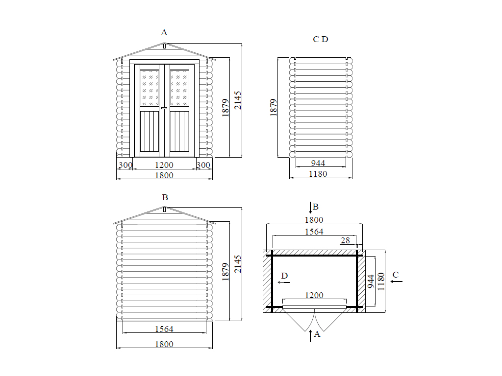 Die Grundfläche des Gartenhauses beträgt 1,48 m² mit einem Sockelmaß von 156,4 x 94,4 cm (B x T). Eine optimale Raumnutzung wird dank einer Firsthöhe von 214,5 cm gewährt.