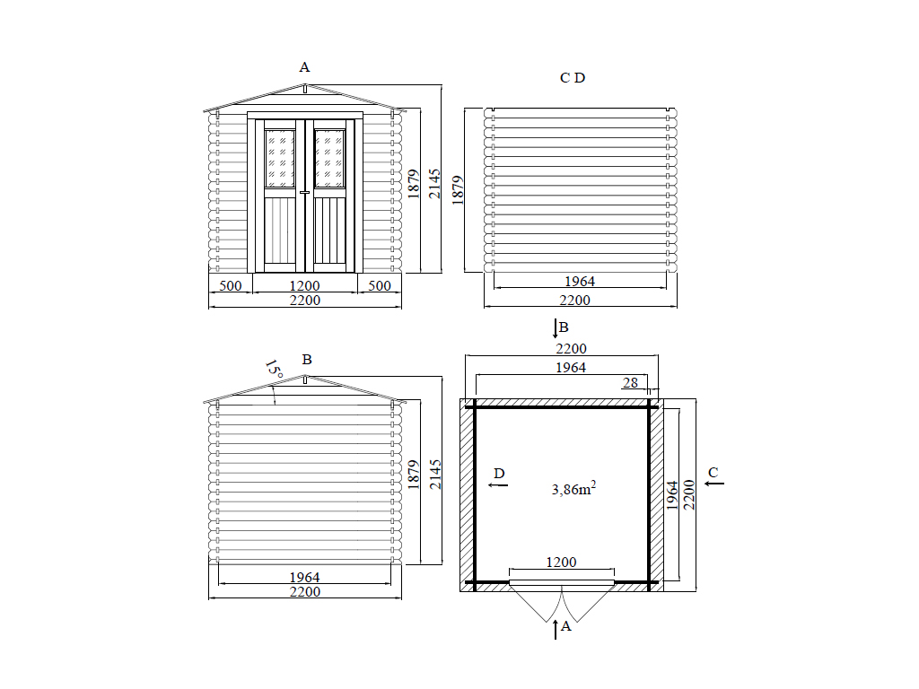 Die Grundfläche des Gartenhauses beträgt 3,86 m² mit einem Sockelmaß von 196,4 x 196,4 cm cm (B x T). Eine optimale Raumnutzung wird dank einer Firsthöhe von 214,5 cm gewährt.