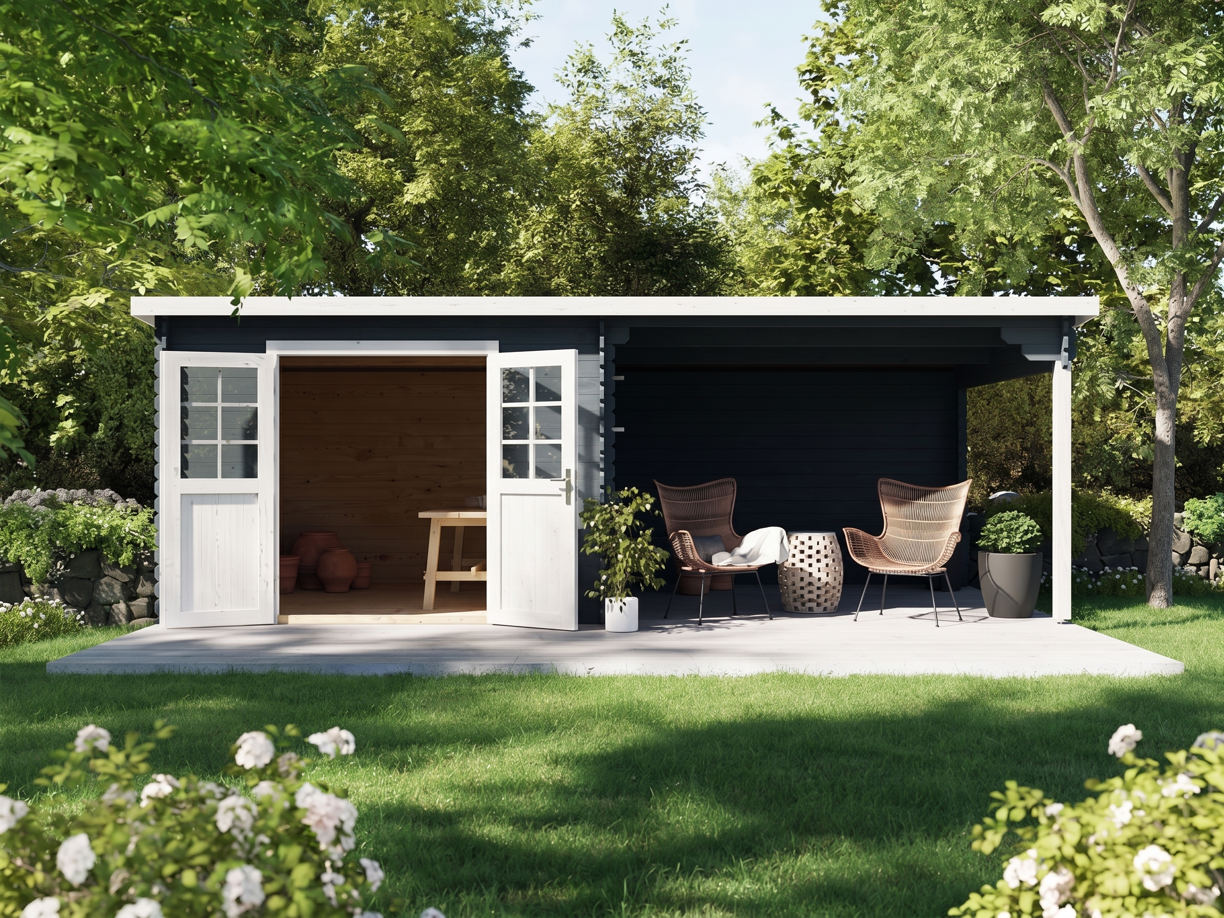 Für mehr Raum und vielfältige Nutzungsmöglichkeiten sorgt dieses Gartenhaus mit Anbaudach. Das großzügig geschnittene Anbaudach ermöglicht es, den Gartenalltag in vollen Zügen im Freien genießen zu können – geschützt vor Sonne, Wind und Regen. Der Platz unter dem Dach kann als gemütliche Terrasse zum Sitzen, Spielen oder Werkeln bei jedem Wetter genutzt werden. Alternativ eignet es sich auch als optimaler Unterstellplatz für zahlreiche Gartengeräte.