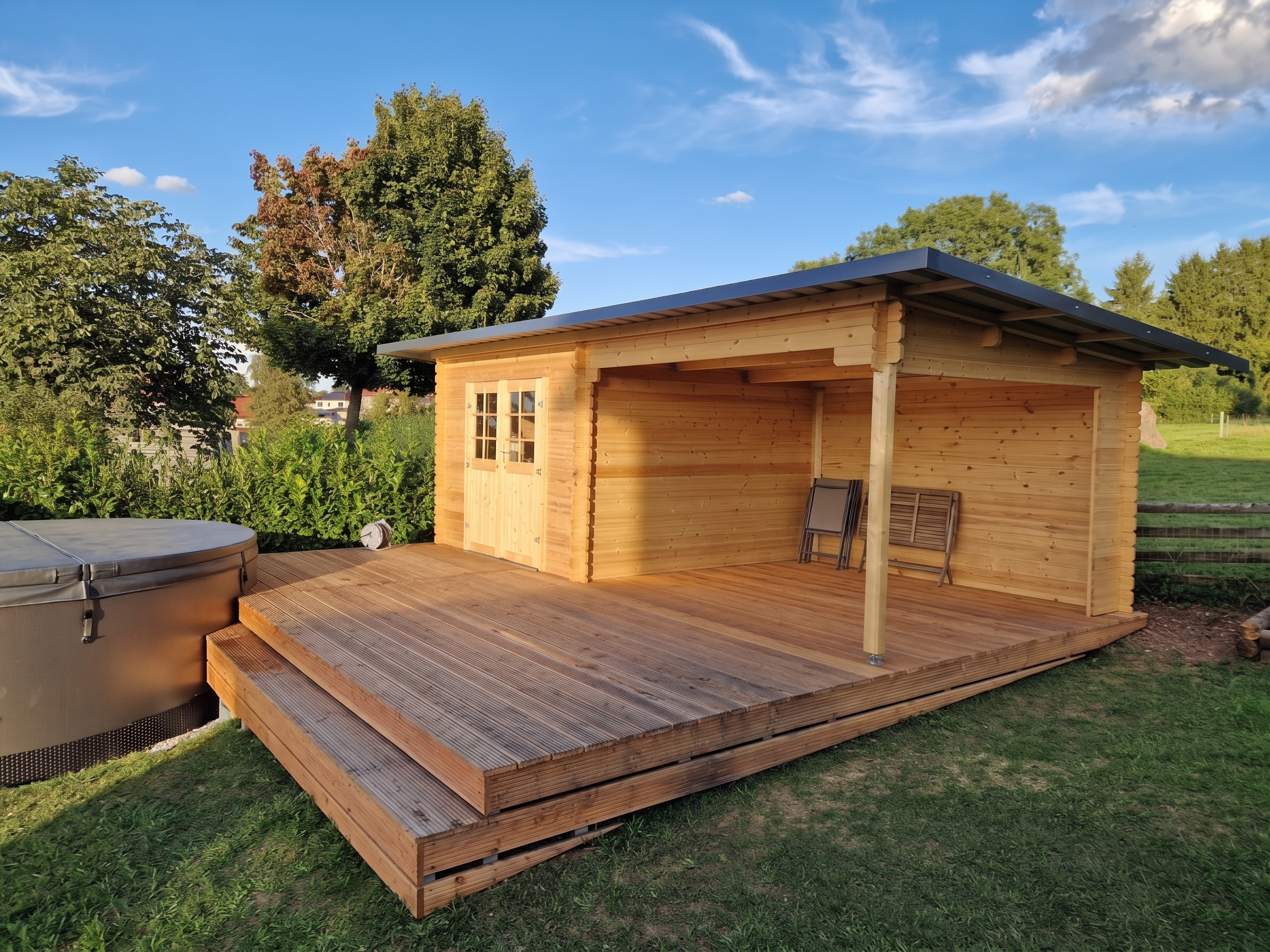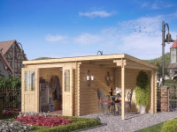 Gartenhaus Blockbohlenhaus CA2977 28 mm naturbelassen mit 3 m Anbau