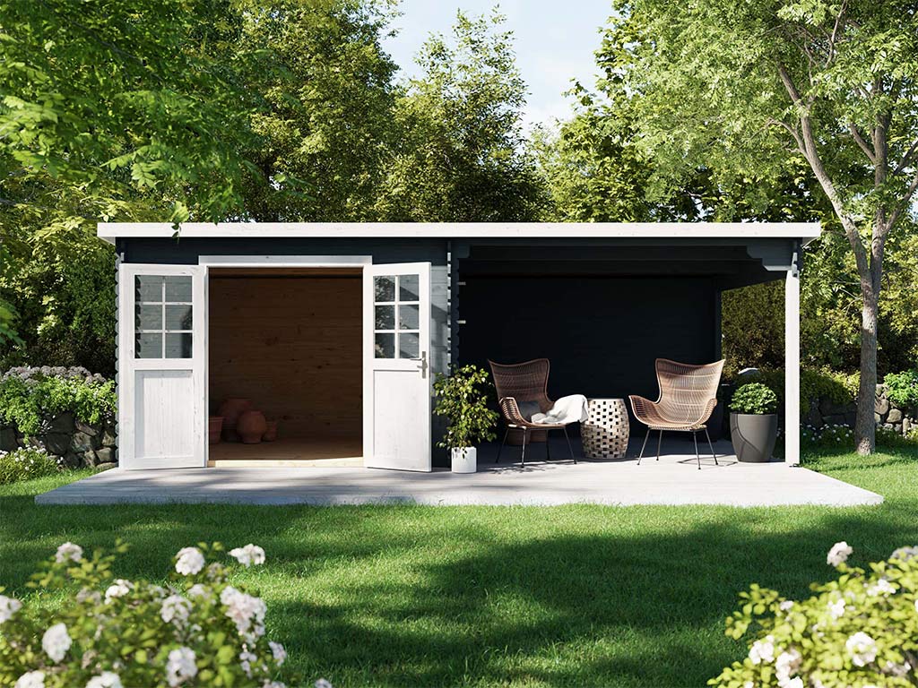 Gartenhaus Blockbohlenhaus CA2977 28 mm naturbelassen mit 3 m Anbau