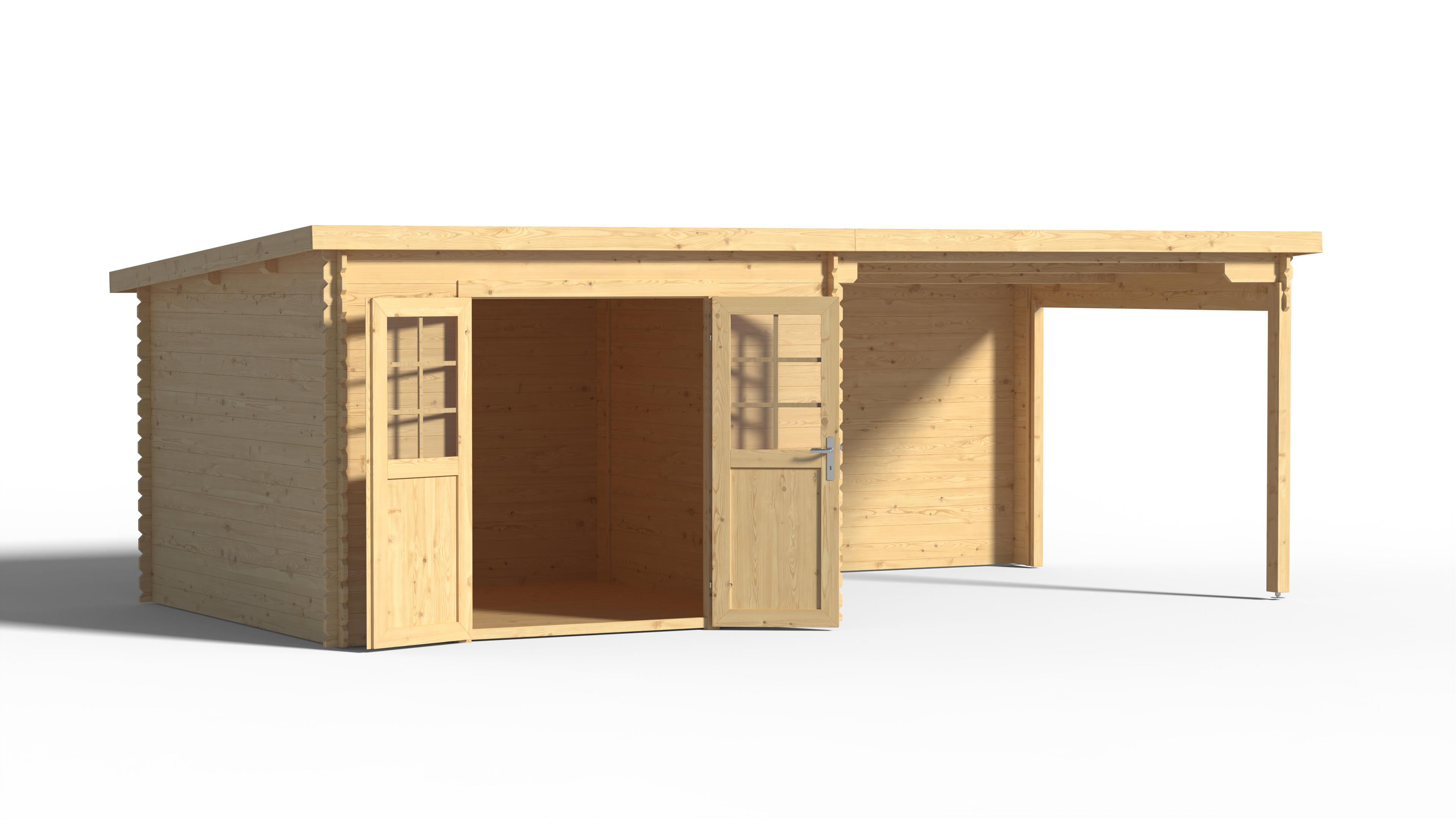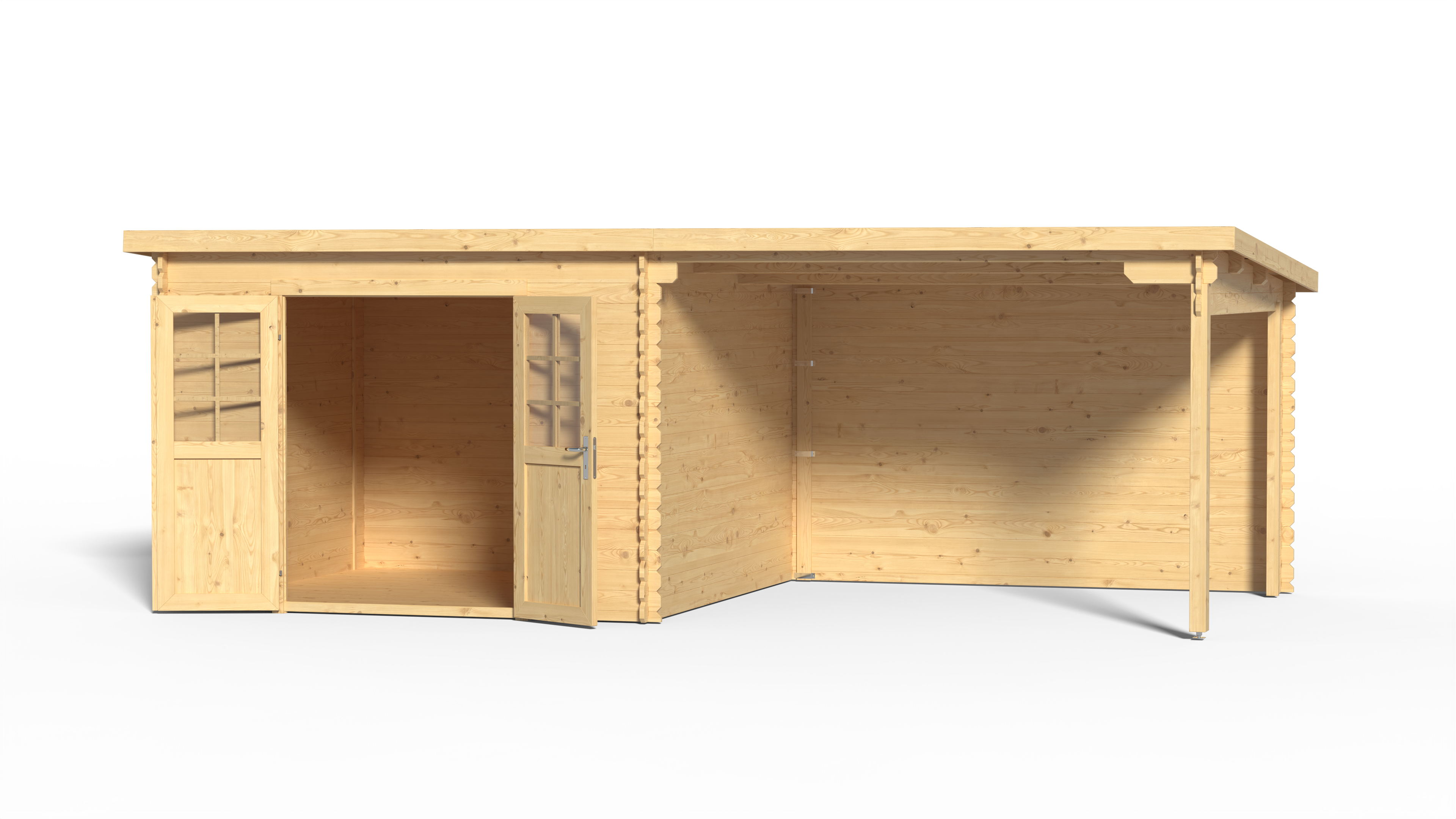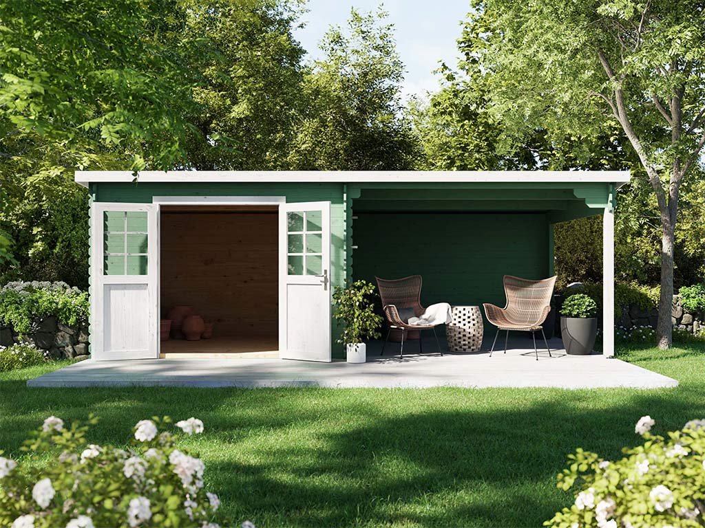 Gartenhaus Blockbohlenhaus CA2977 28 mm naturbelassen mit 3 m Anbau