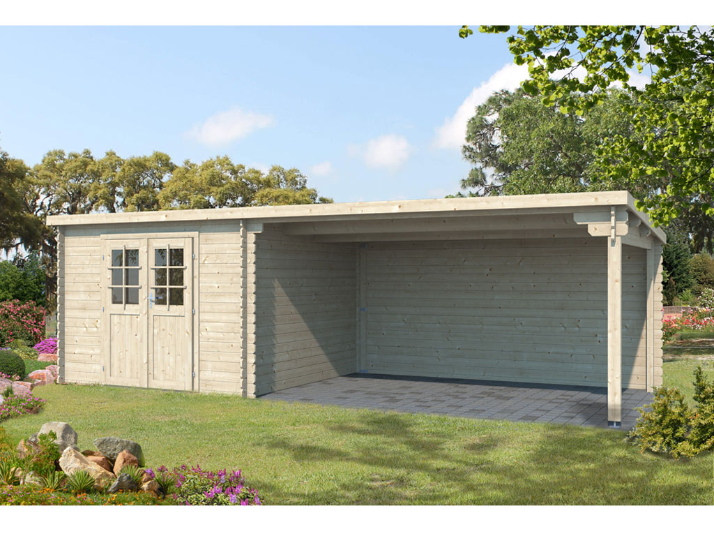 Gartenhaus Blockbohlenhaus CA2978 28 mm naturbelassen mit 4 m Anbau