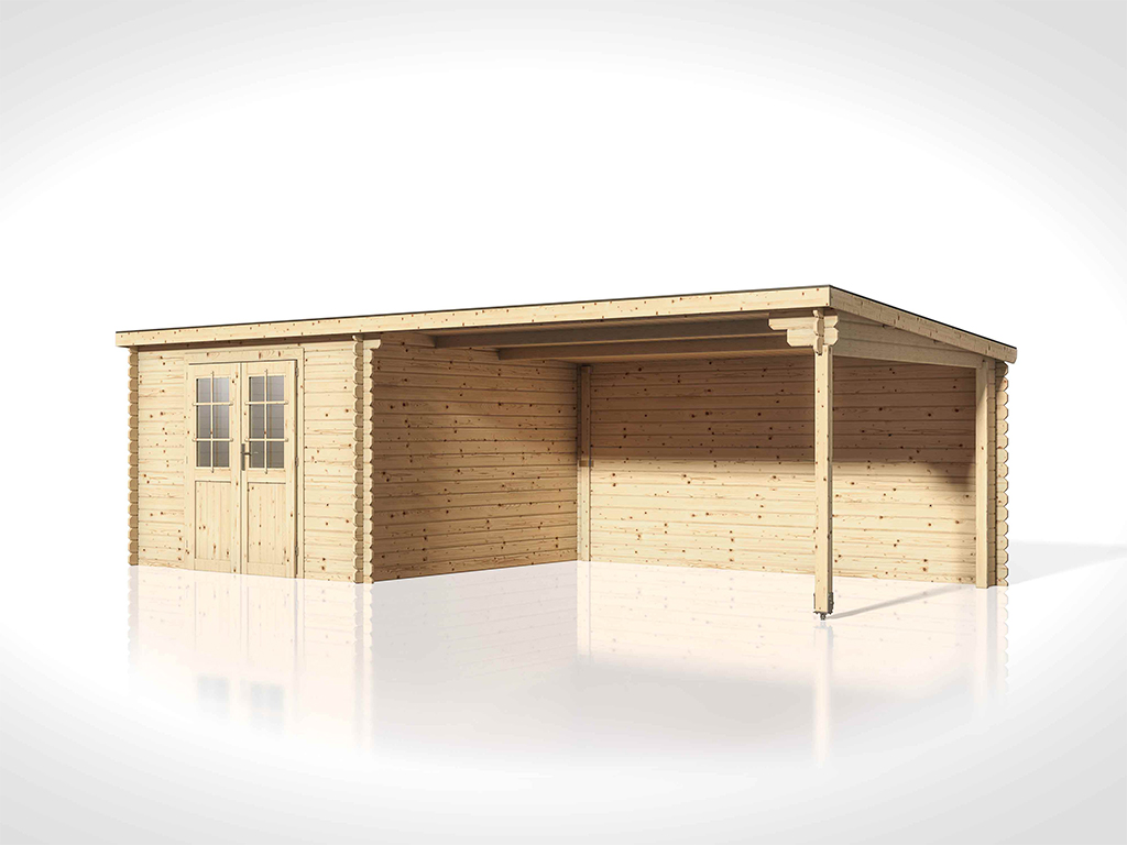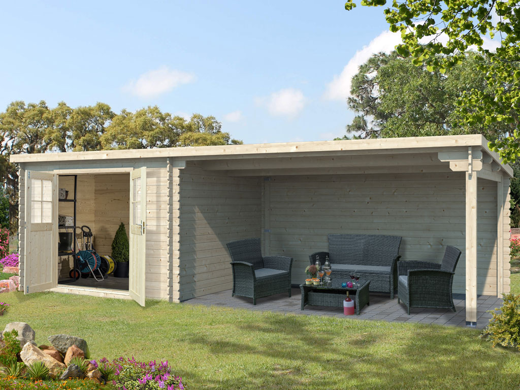 Gartenhaus Blockbohlenhaus CA2978 28 mm naturbelassen mit 4 m Anbau