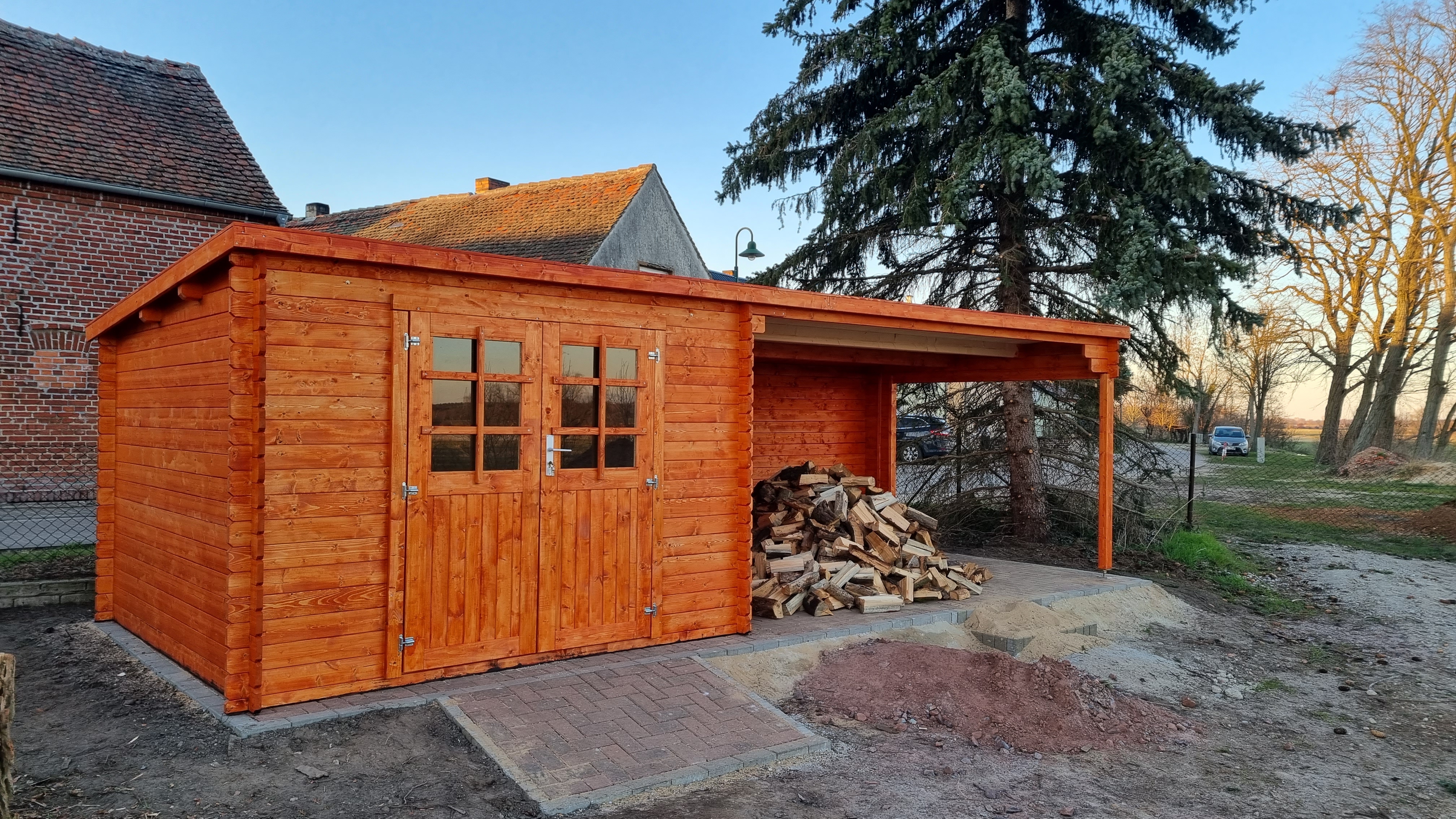 Von der Bestellung bis zur Lieferung lief alles reibungslos. Der Aufbau war sehr einfach und mit ein paar helfenden Händen ziemlich schnell erledigt. Man kann den Anbau je nach Wunsch rechts oder linksseitig der Hütte aufbauen.