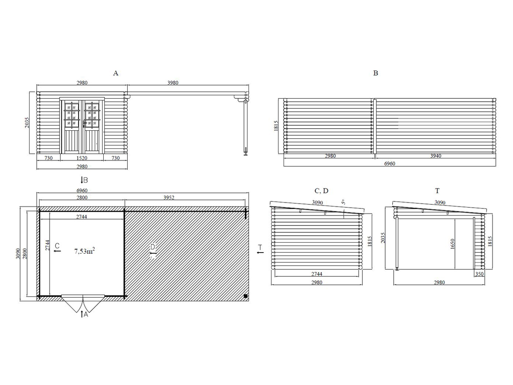 | Außenmaß inkl. Dachüberstand (B x T): | 696 x 309 cm |