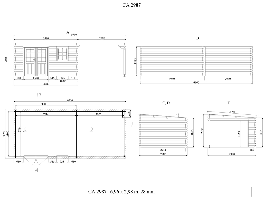 | Außenmaß inkl. Dachüberstand (B x T): | 696 x 309 cm |