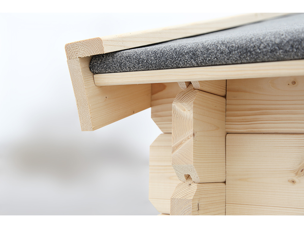 Die Wände des Blockbohlenhauses setzen sich aus vorgefertigten Holzbohlen zusammen, die dank einer Nut- und Feder-Verbindung ohne größere Anstrengungen aufeinandergesteckt werden können. Damit ist ein einfacher und schneller Auf- und Abbau garantiert. An der Kopfseite des Gartenhauses sorgt die charakteristische Verkämmung (spezielle Einkerbungen im Holz) nicht nur für eine einzigartige Optik, sondern hält das ganze Konstrukt auch zusammen und macht es absolut wind- und wetterfest.