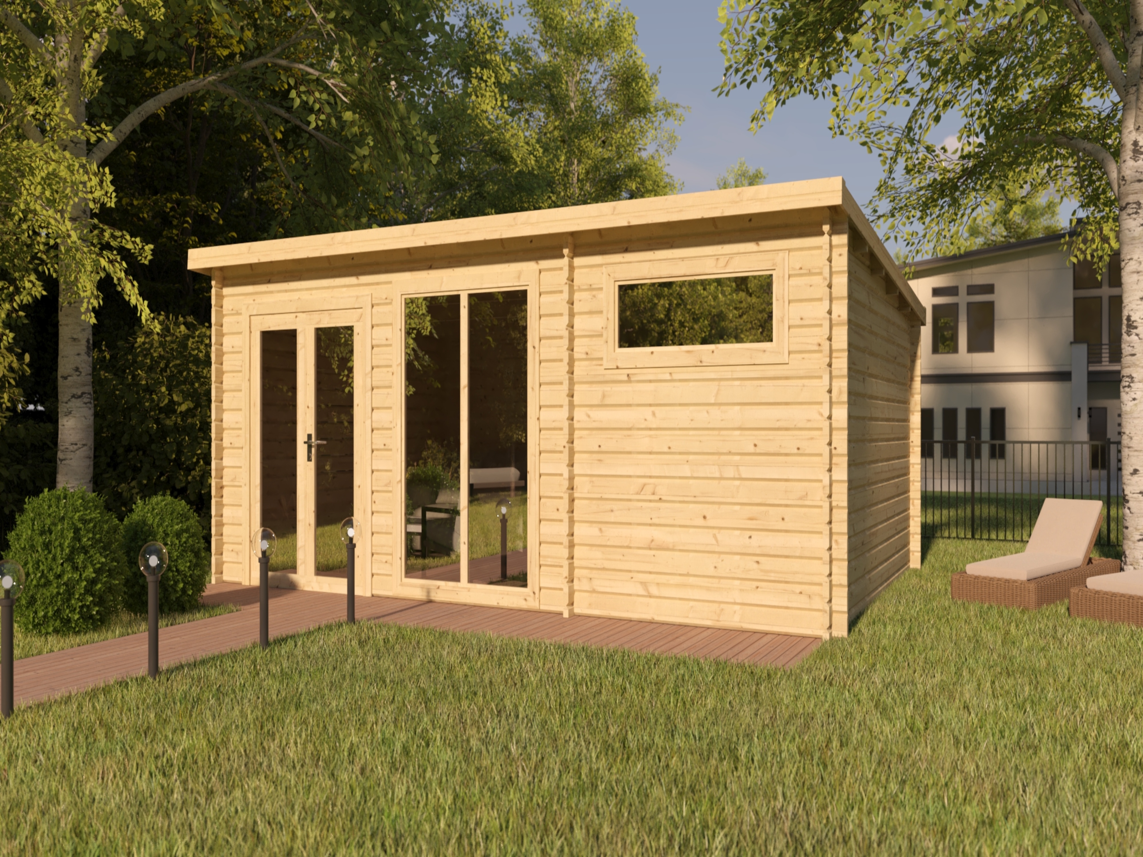 Ein modernes Pultdach verleiht deinem Gartenhaus eine stilvolle, elegante Optik. Durch nur eine geneigte Dachfläche ist die Nutzungsfläche im Inneren des Gartenhauses deutlich weniger eingeschränkt und der Verlust an Nutzraum gering. Zudem lässt die Neigungsseite des Pultdaches das Regenwasser gut abfließen und es ist die Montage von nur einer Regenrinne nötig.