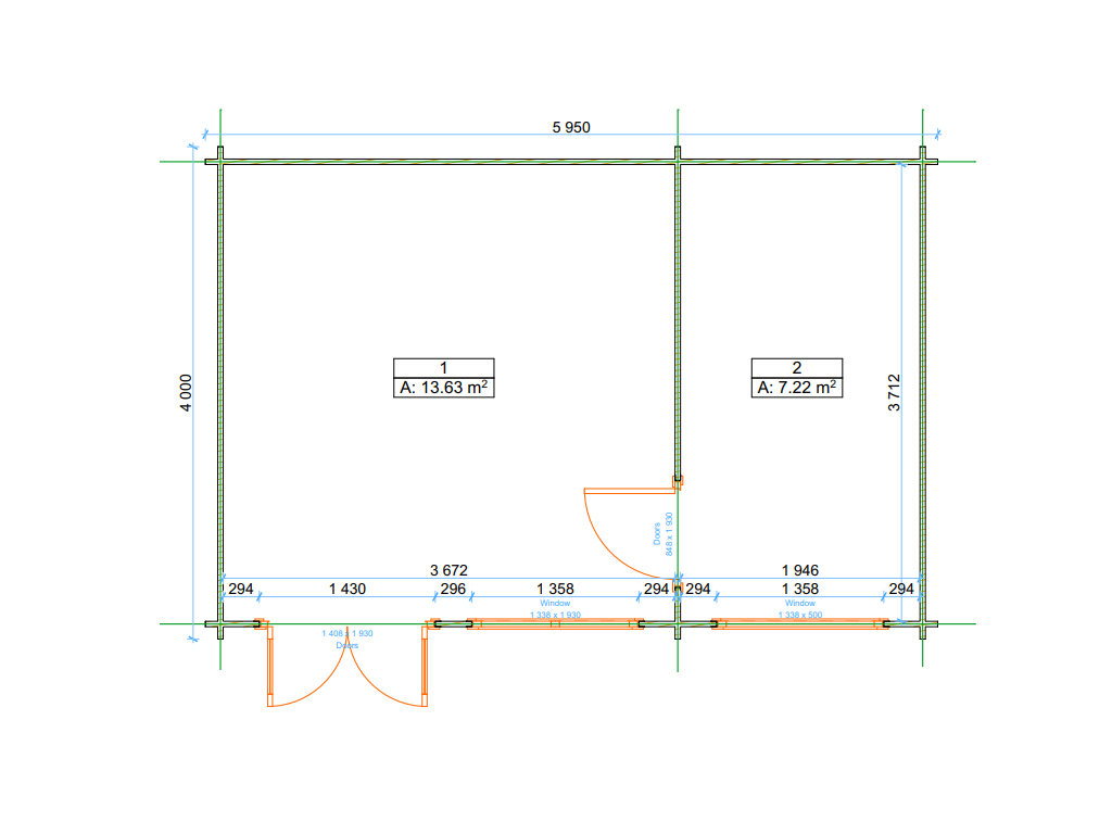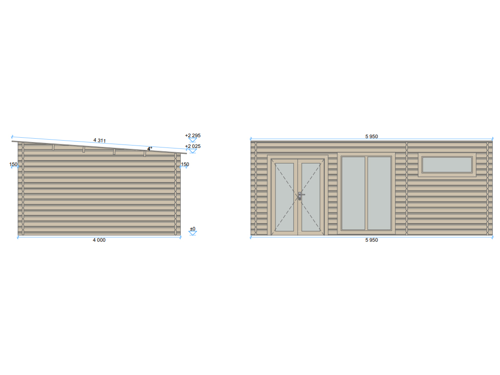 B x T x H: 595 x 430 x 229 cm, Sockelmaß Haus: B x T: 595 x 400 cm, Isolierverglasung