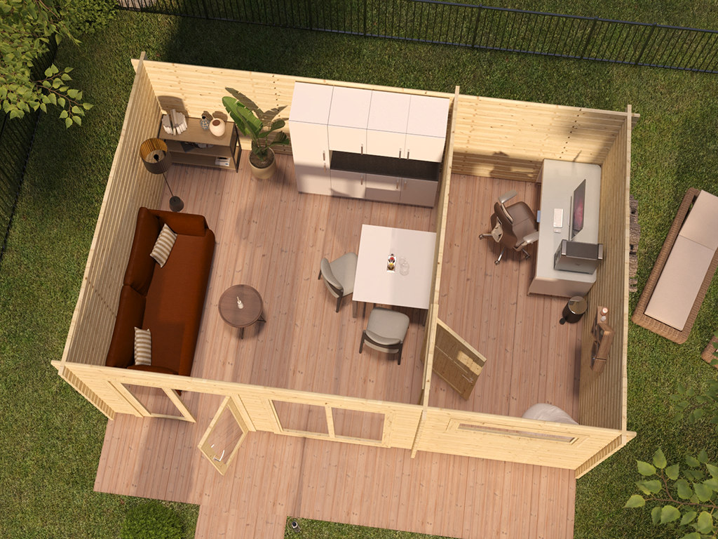 Die Grundfläche des Gartenhauses beträgt 20,85 m². Eine optimale Raumnutzung wird dank einer Firsthöhe von 229 cm gewährt.