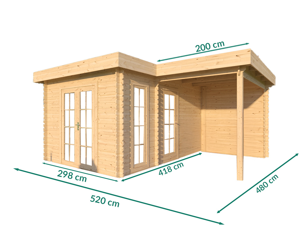 B x T x H: 520 x 418 x 236 cm, Sockelmaß Haus: B x T: 280 x 398 cm, inkl. 200 cm Anbau