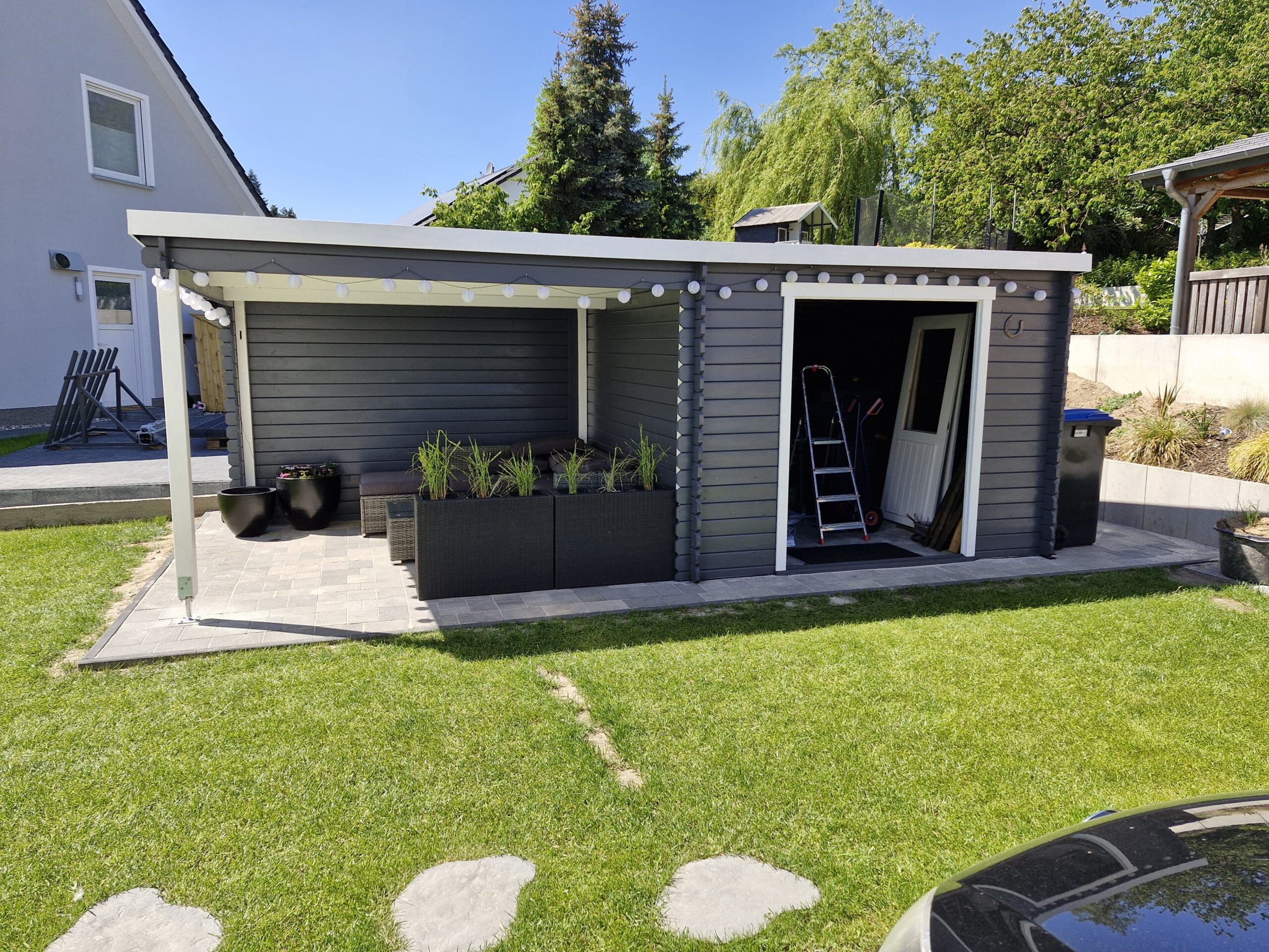Das Gartenhaus mit Anbaudach und Rückwand ist sehr vielseitig. Der durch das Anbaudach geschaffene zusätzliche Stauraum eignet sich optimal als Lagerplatz für Gartenutensilien oder als Sitzbereich zum gemütlichen Verweilen. Dank Überdachung und integrierter Rückwand sind Geräte und Gartenmöbel optimal vor Wind und Wetter geschützt.