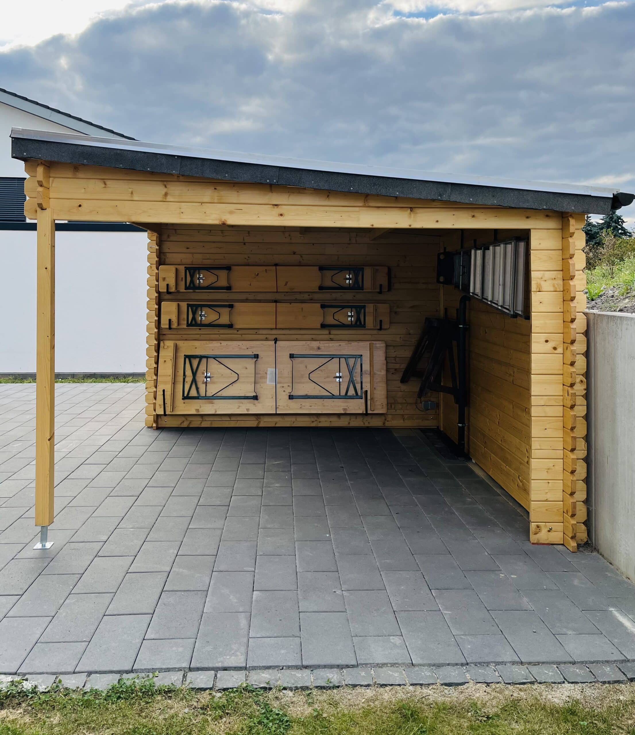Als der Klassiker unter den Gartenhäusern verfügt ein Blockbohlenhaus über eine sehr robuste Bauweise, gepaart mit einer besonderen, natürlichen Ästhetik. Dabei orientiert sich die Bohlenbauweise an der traditionellen Blockhütte. Die Wände setzen sich aus vorgefertigten Holzbohlen zusammen, die dank einer Nut- und Feder-Verbindung ohne größere Anstrengungen aufeinander gesteckt werden können. Damit ist ein einfacher und schneller Auf- und Abbau garantiert. An der Kopfseite des Gartenhauses sorgt die charakteristische Verkämmung (spezielle Einkerbungen im Holz) nicht nur für eine schöne Optik, sondern hält das ganze Konstrukt auch zusammen und macht es absolut wind- und wetterfest.